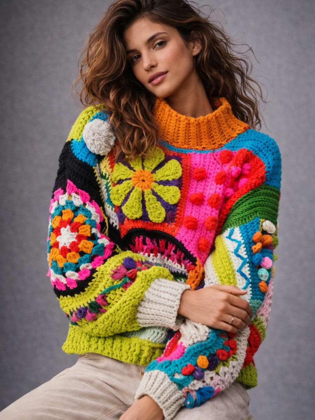 Bohemian Forest Style Colorful Three-Dimensional Mushroom Flower Grid Contrasting Decorative Crochet Sweater