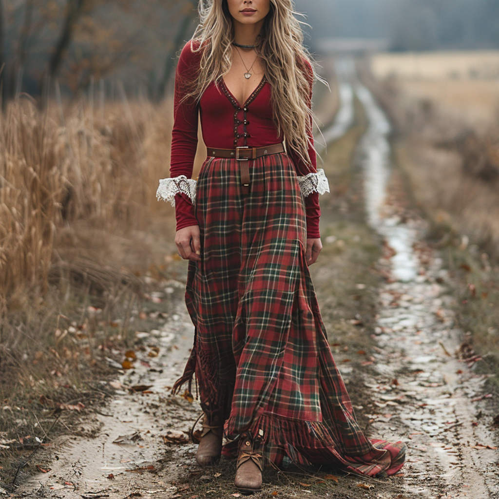 Women's Vintage V-neck Bohemian Pastoral Plaid Style Long-sleeve Maxi Long Dress