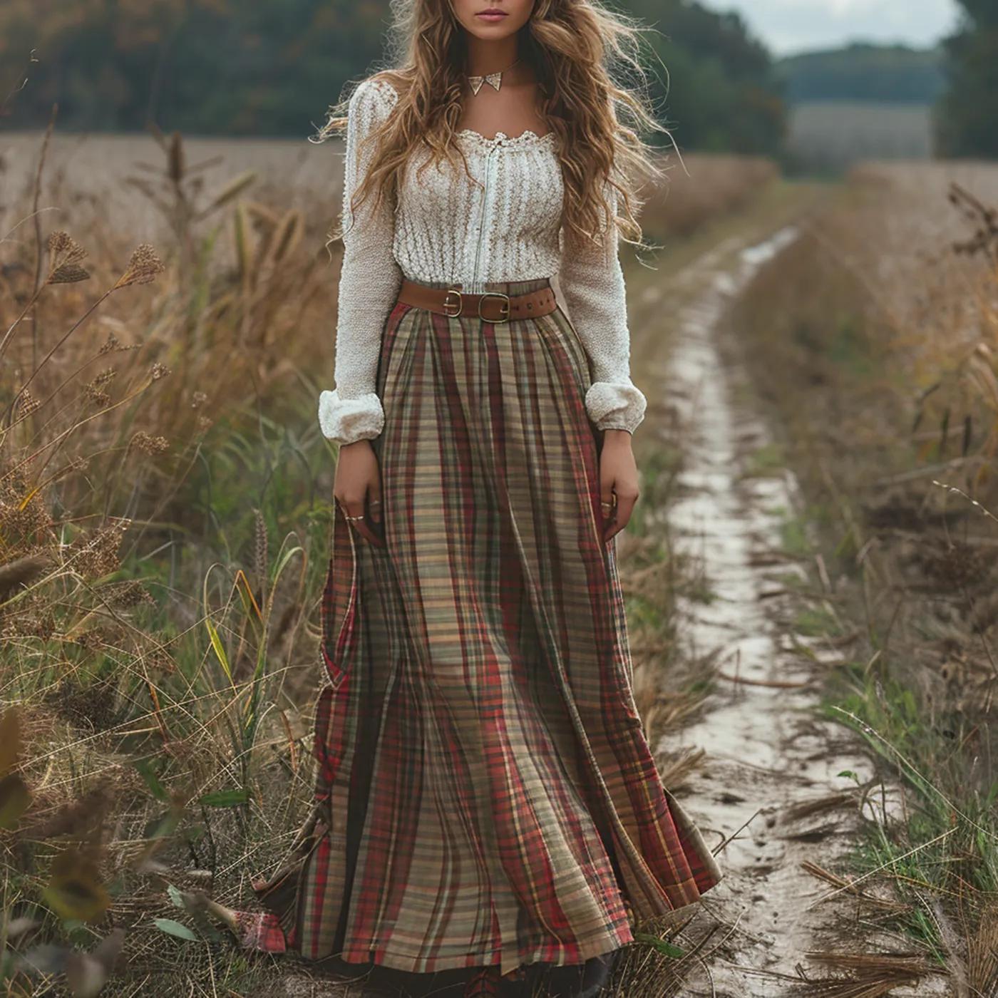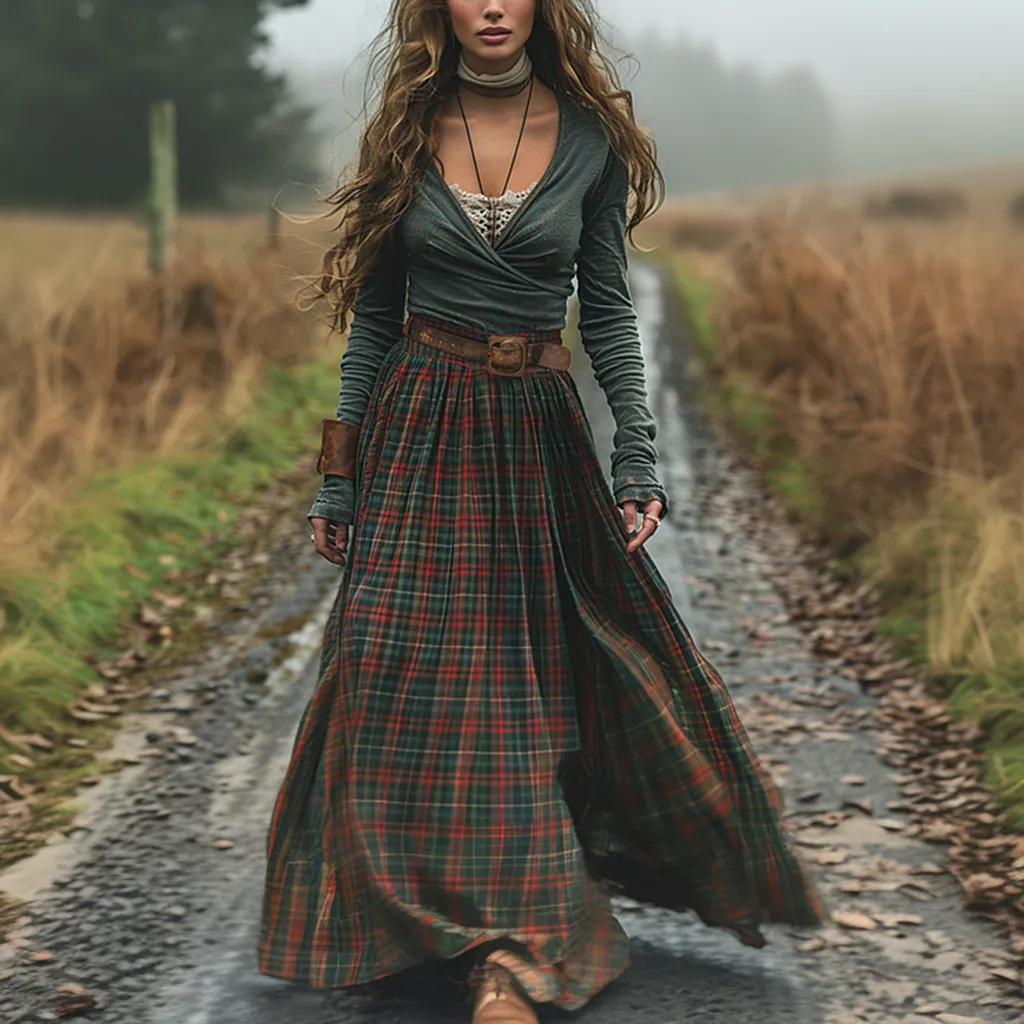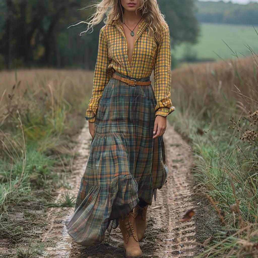 Women's Retro Plaid V-neck Long-sleeve Long Skirt Pastoral Style Maxi Long Dress