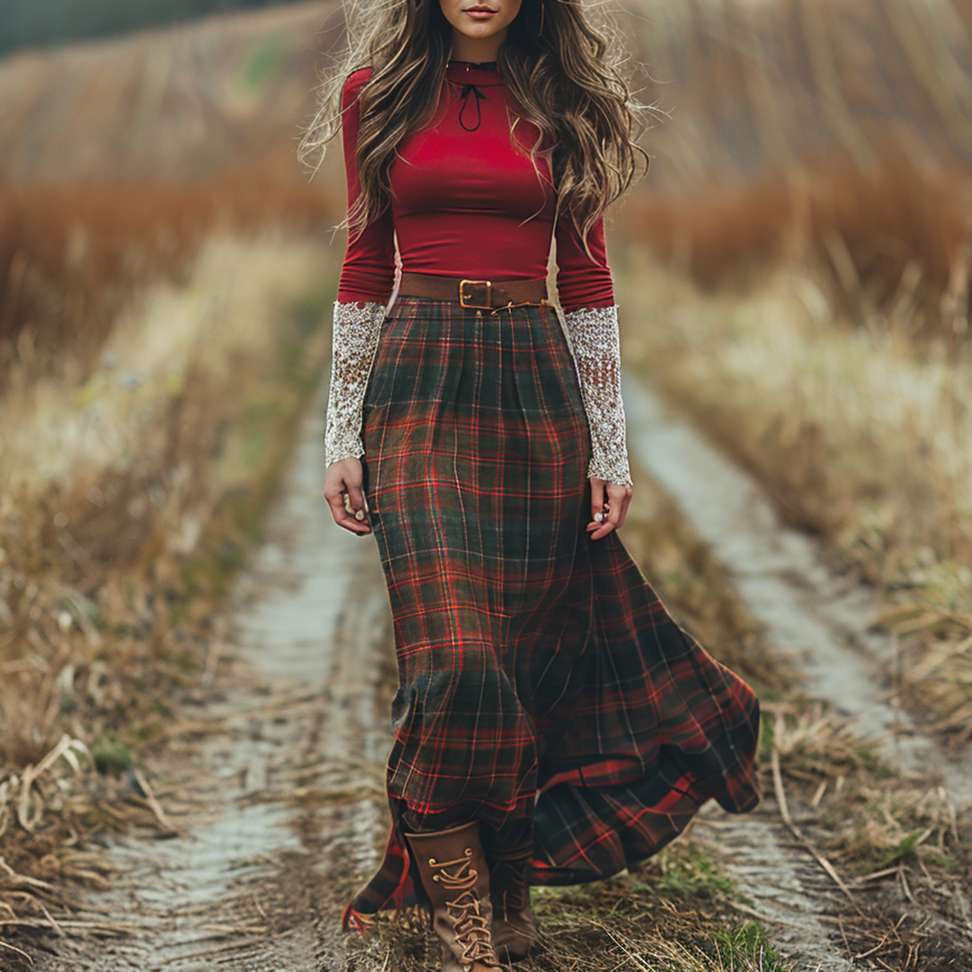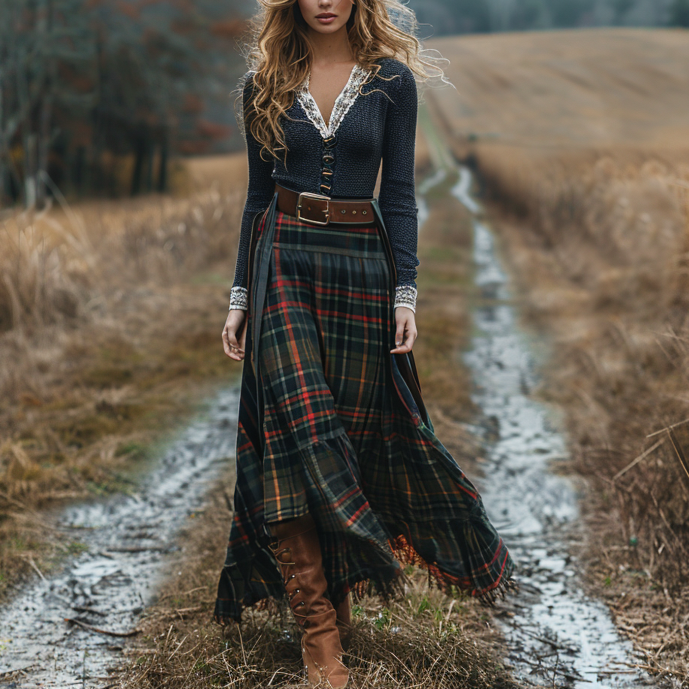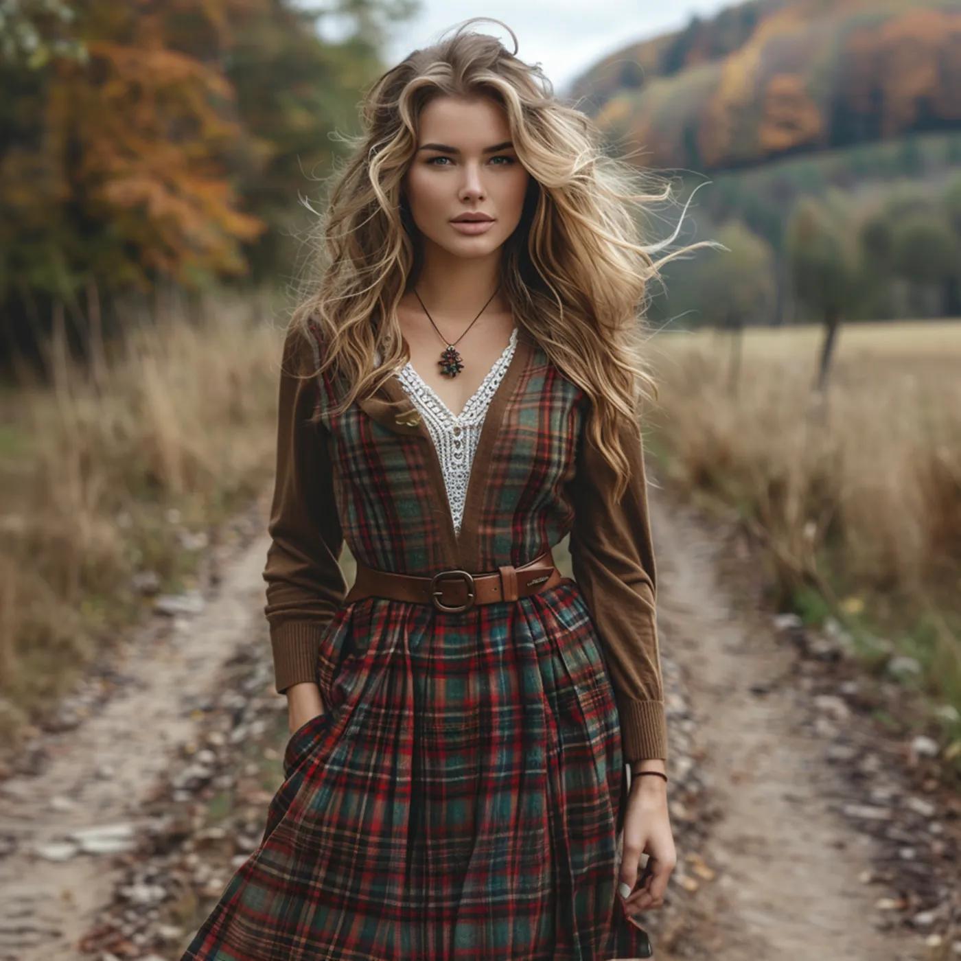 Women's Retro Plaid V-neck Long-sleeve Long Skirt Pastoral Style Maxi Long Dress