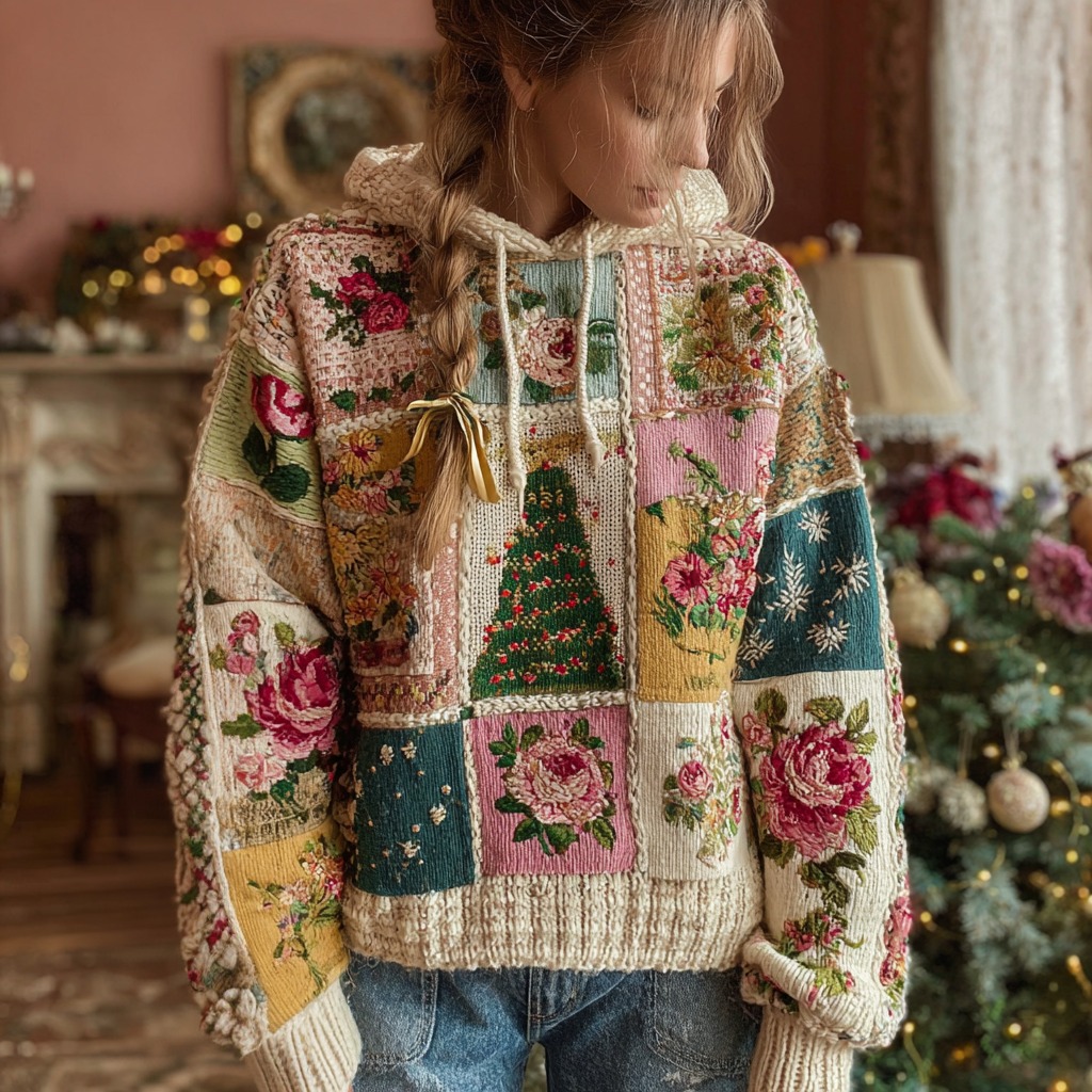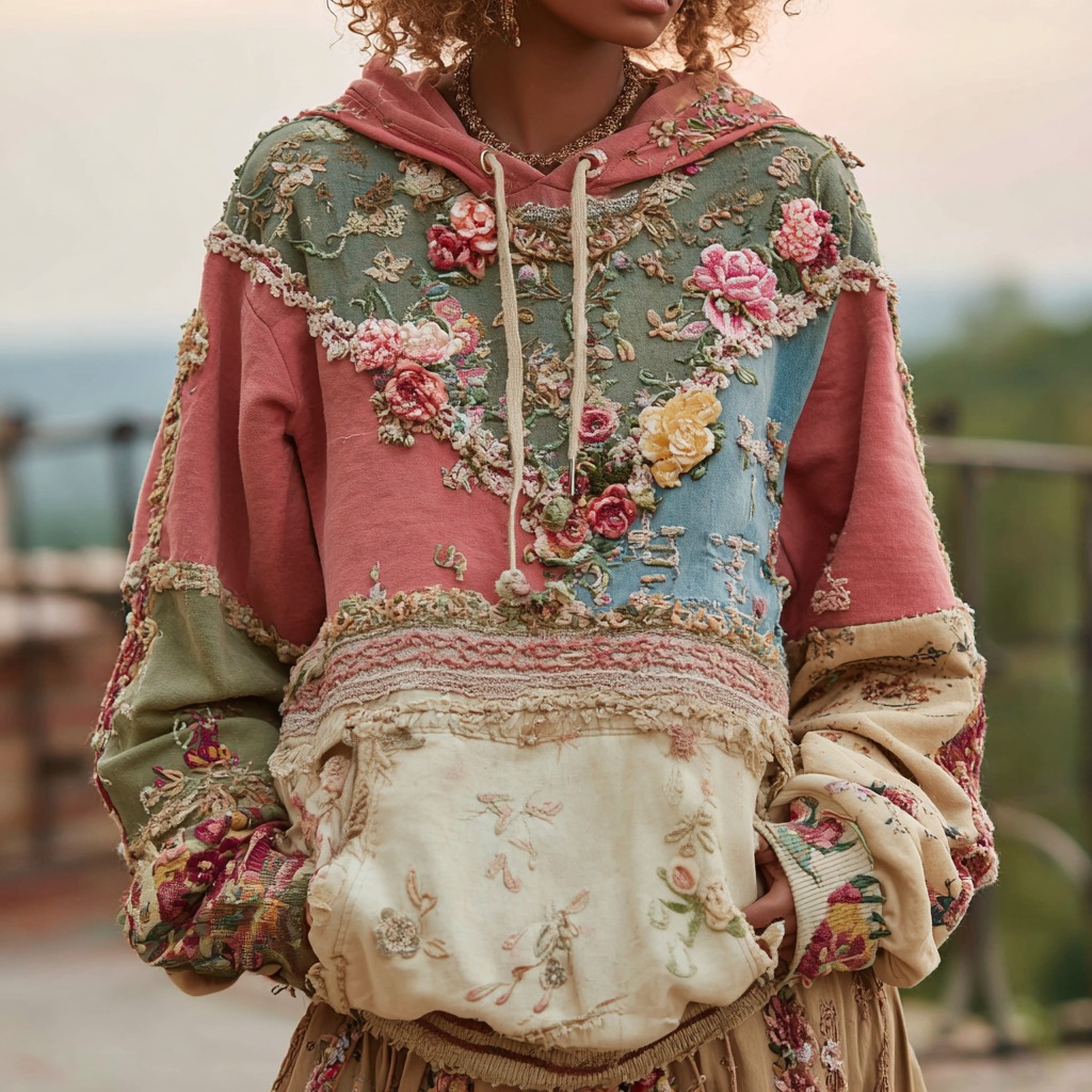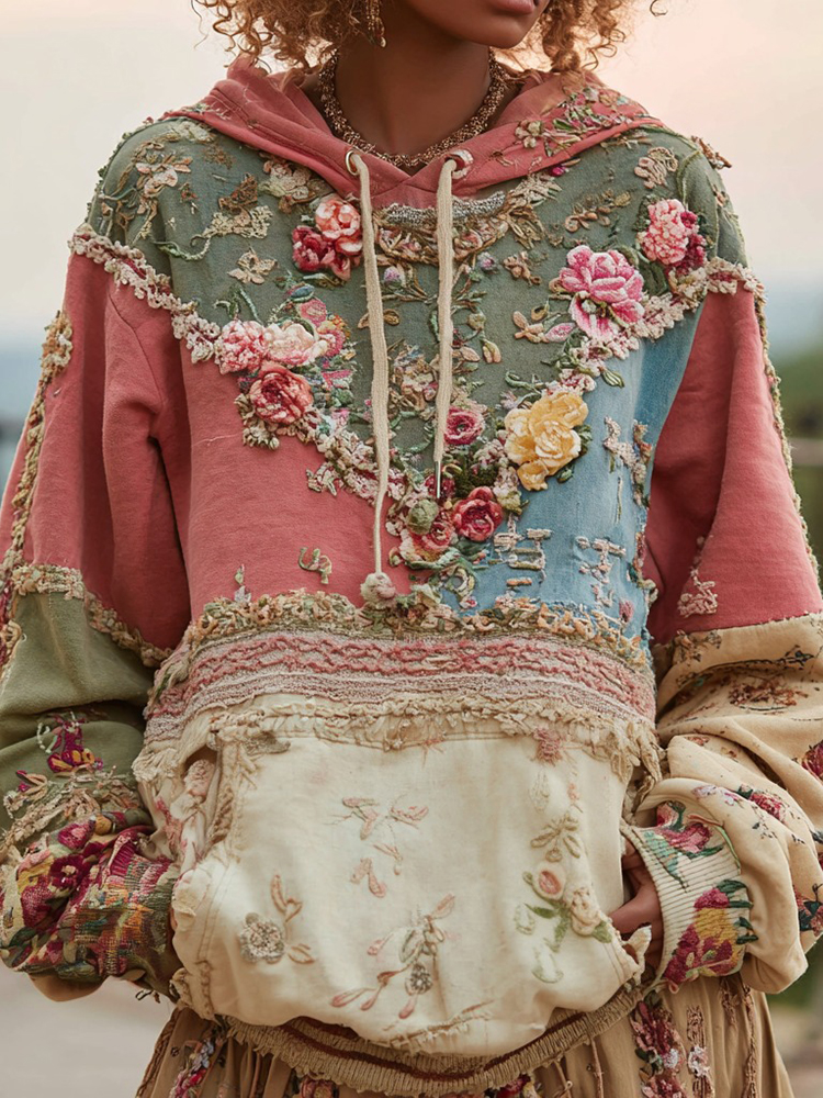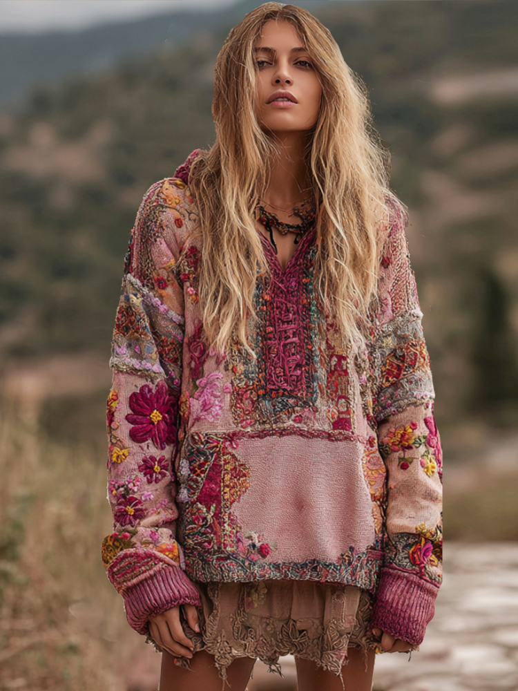 Bohemian Style Three-dimensional Flower Embroidery Light Pink Patchwork Vintage Hooded Long-sleeved Sweater