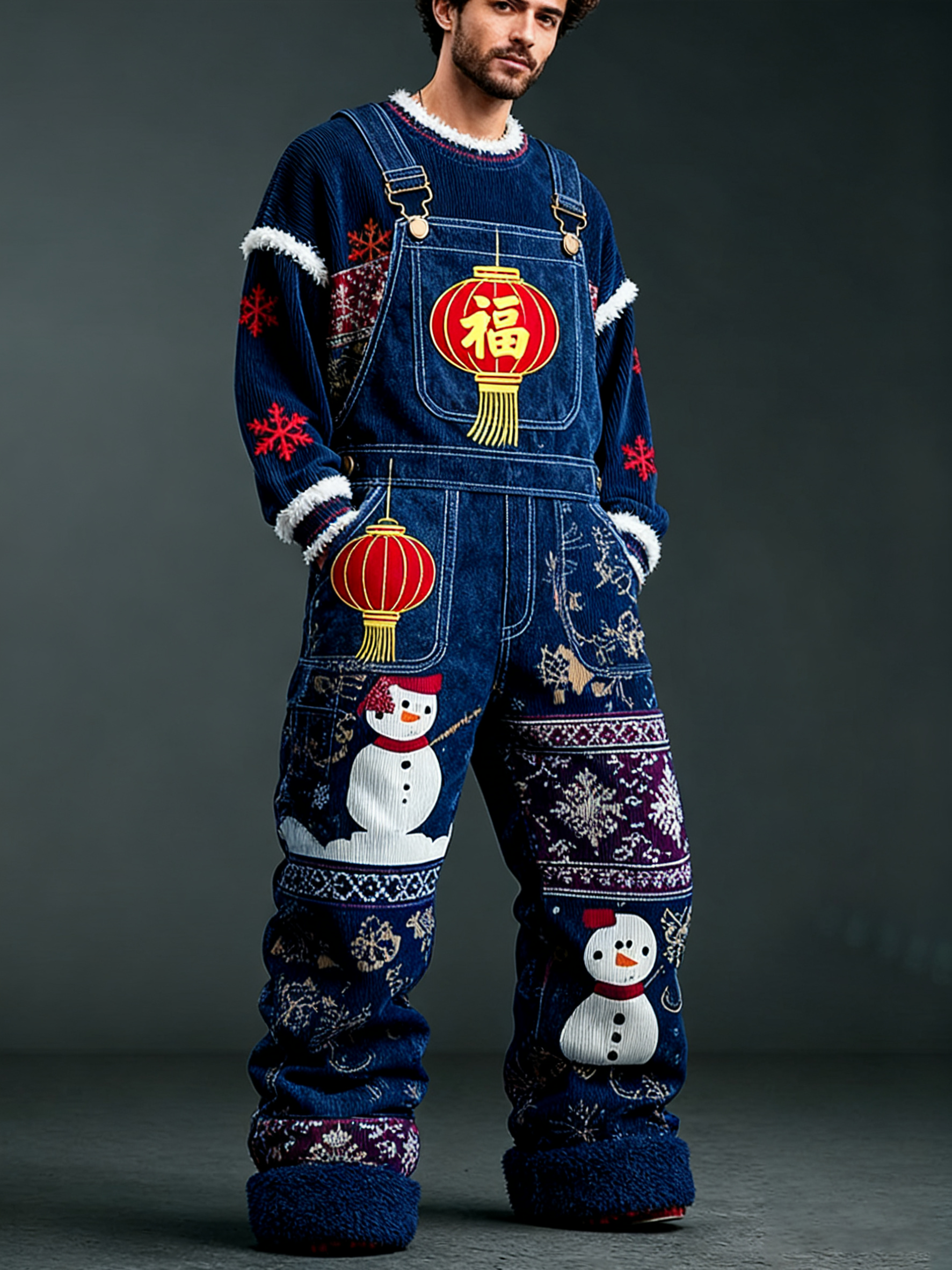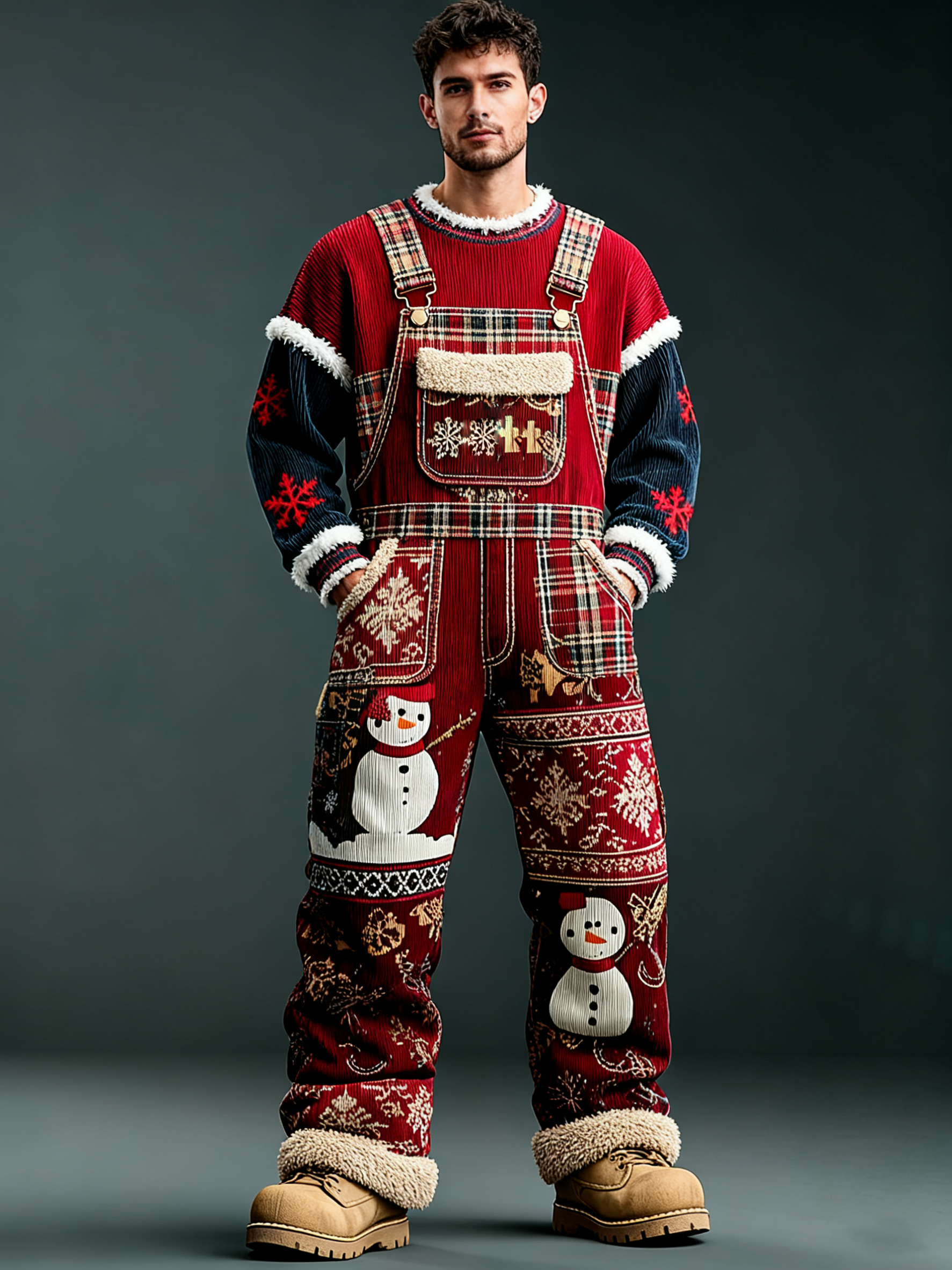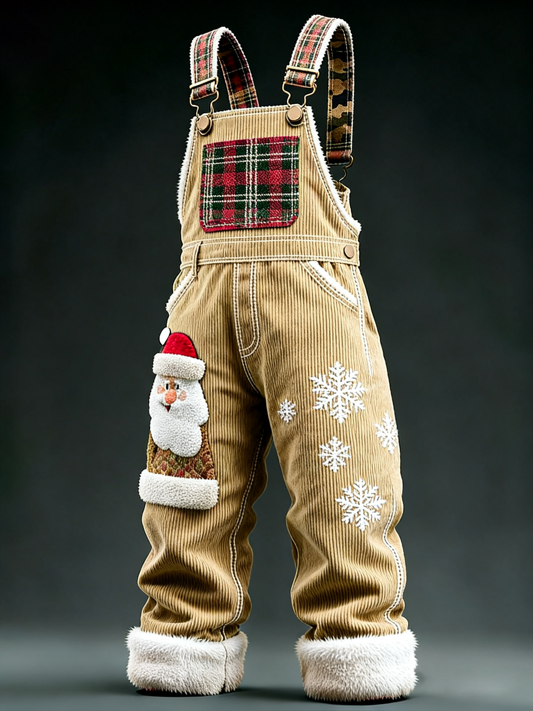 Men'S Christmas Themed Embroidered Checkered Patchwork Christmas Party Warm Work Pants