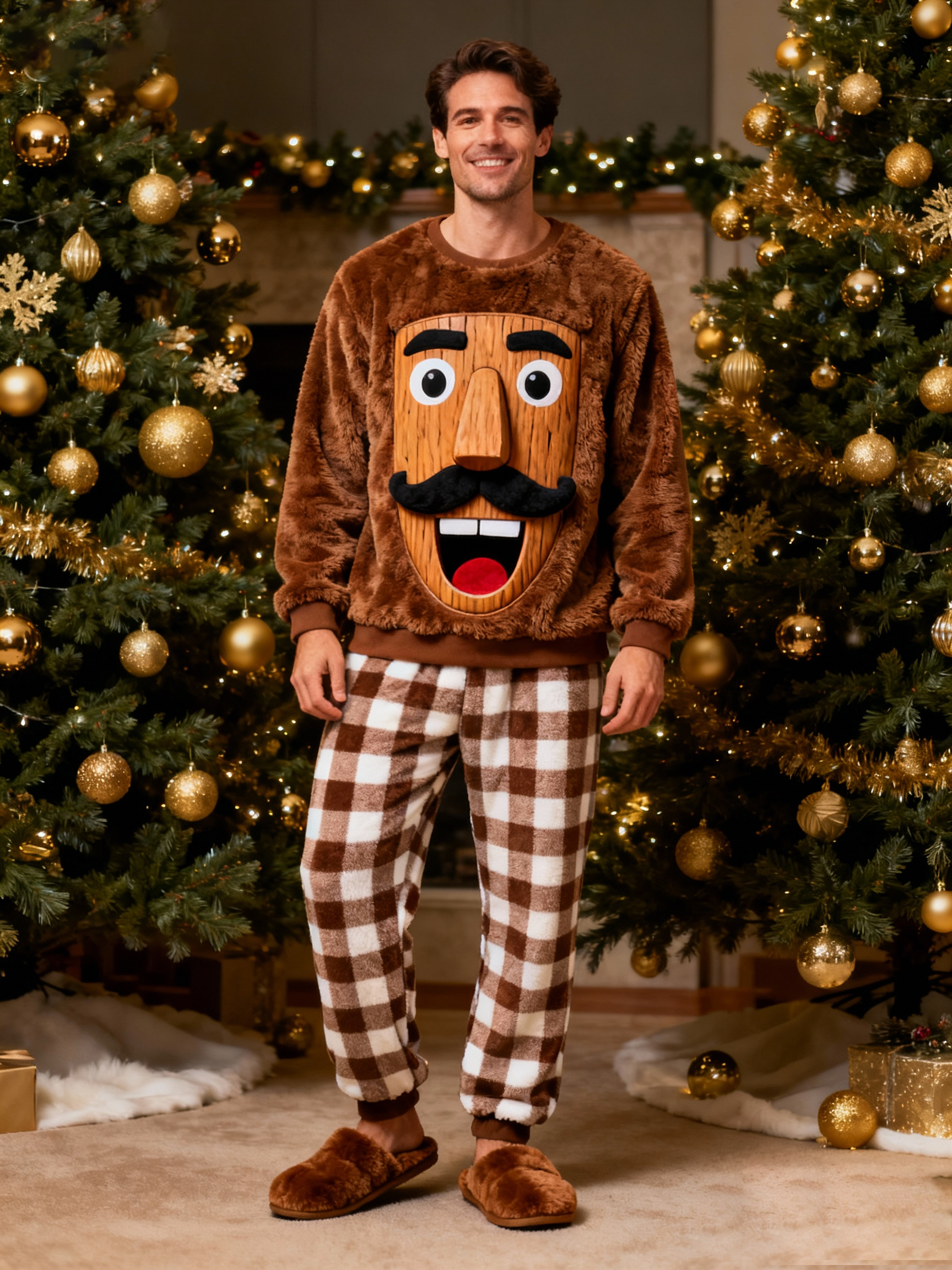 Men'S Cute Creative Exaggerated Monster Color Clash Checkered Top Pants Plush Two Piece Set