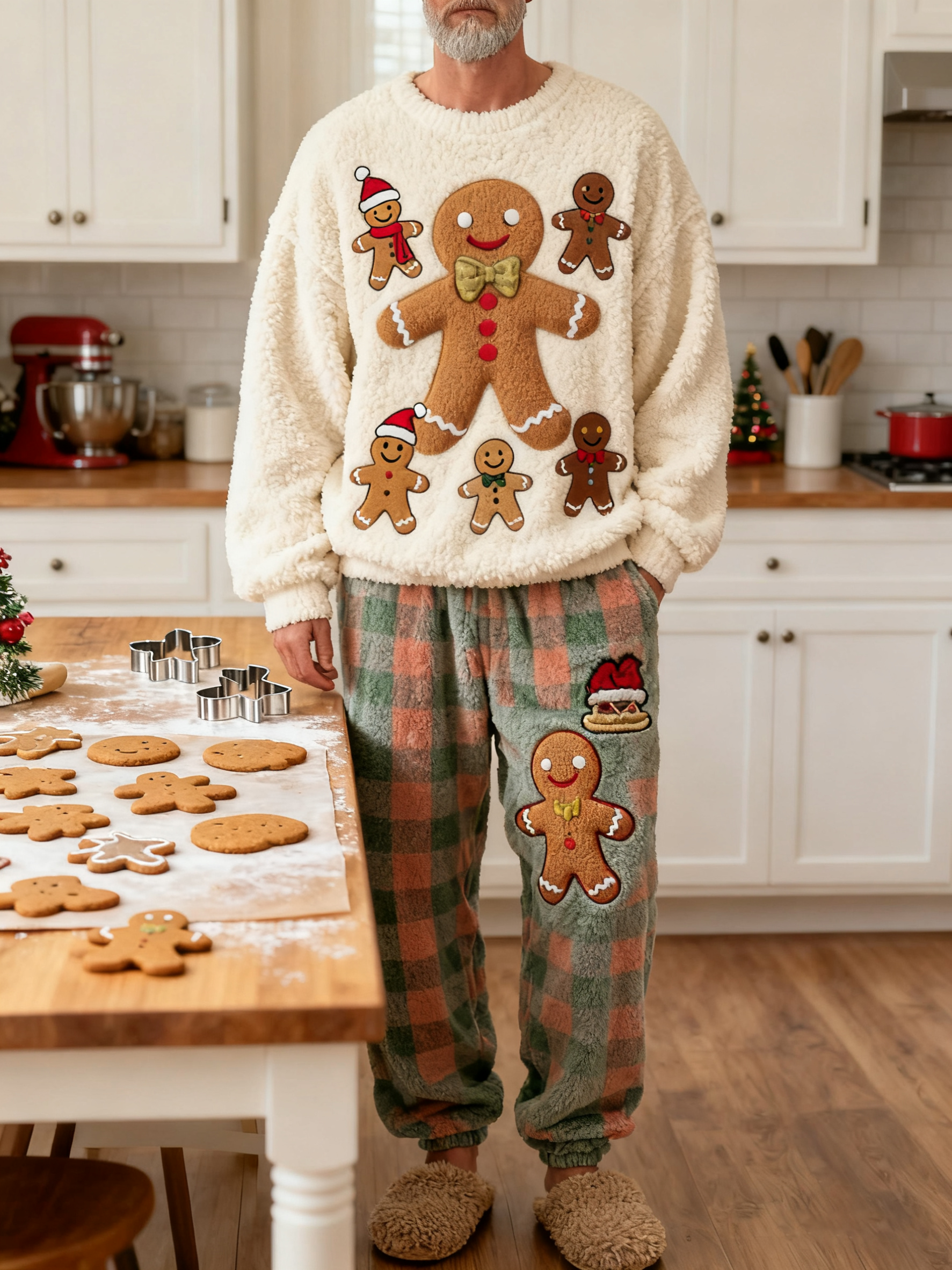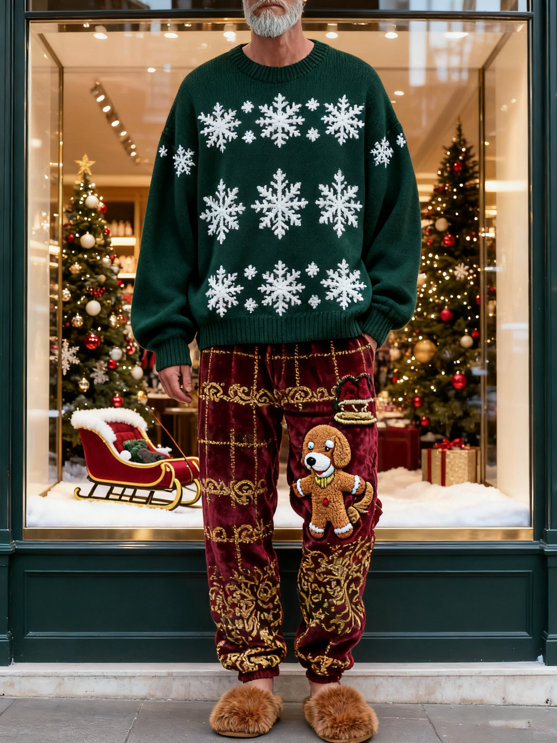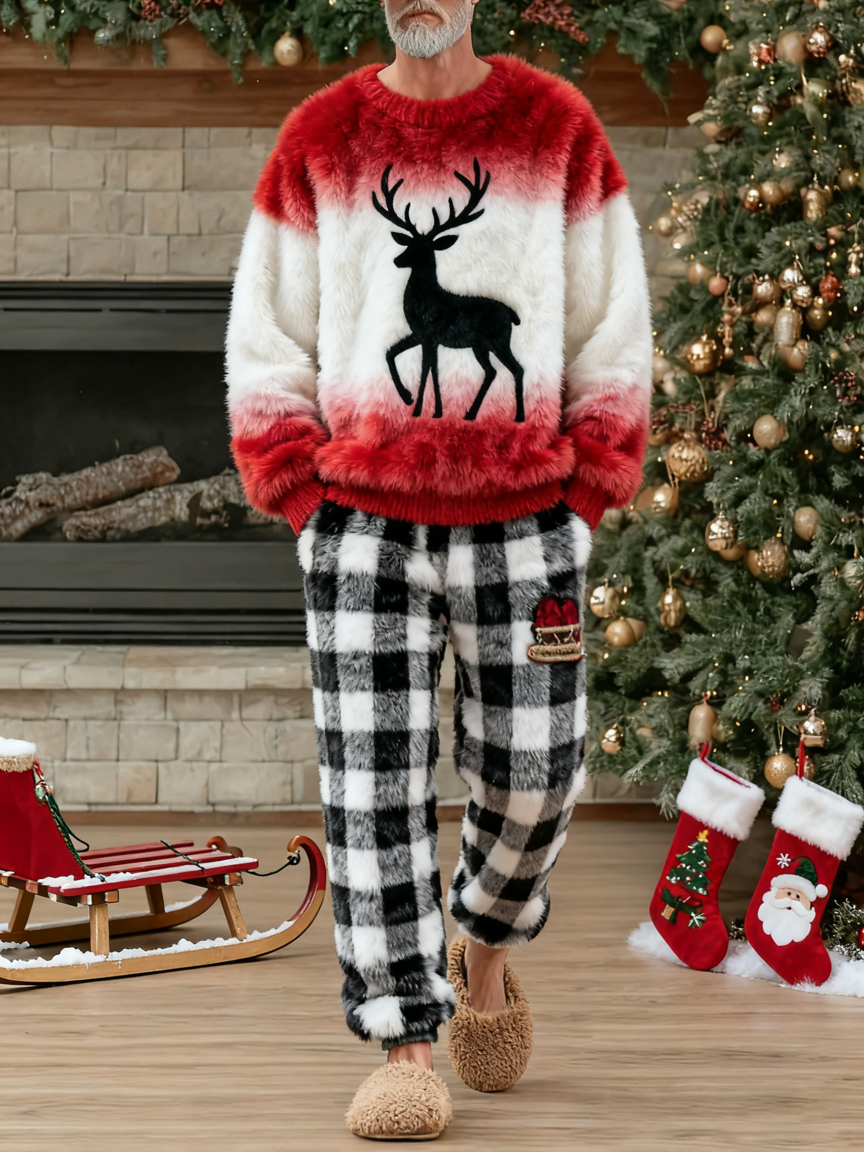 Men'S Christmas Warm Fashion Set Red Self Wool Gradient Reindeer Sweater+Black And White Plaid Pants