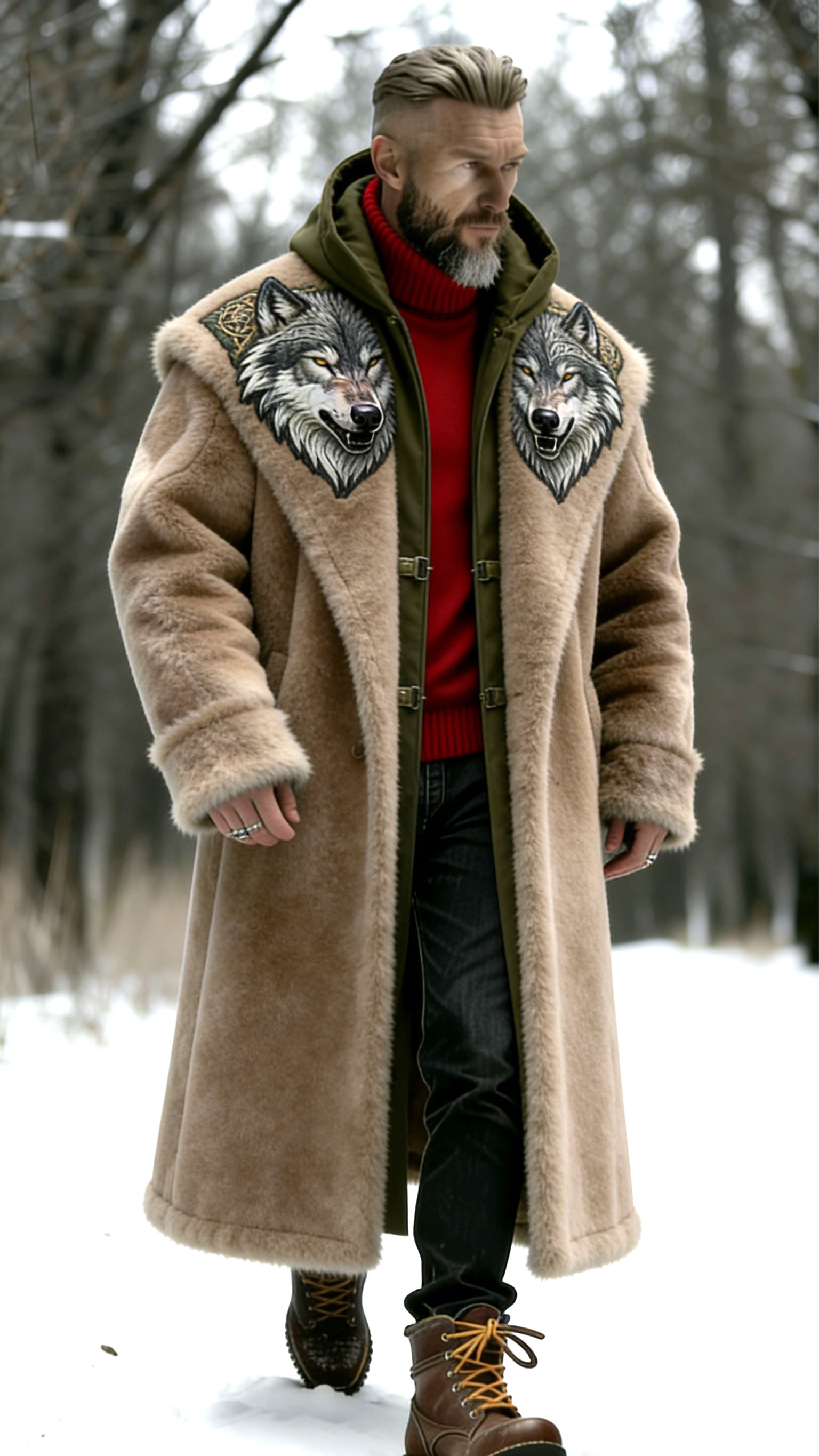 Men'S Casual Wilderness Traveler Khaki Hooded Double Wolf Head Embroidered Fur Coat