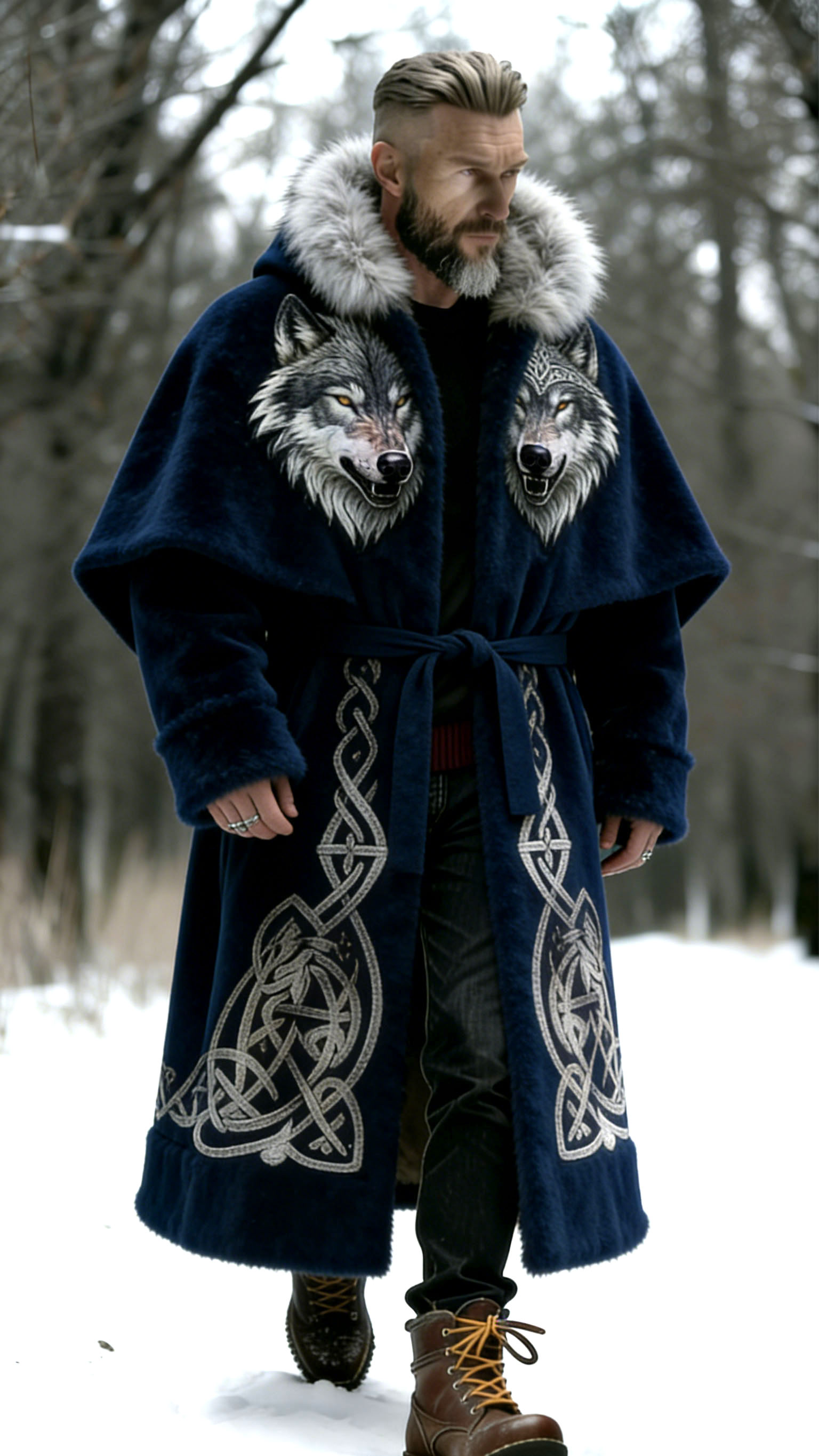 Men'S Dark Blue Hooded Waistband With Celtic Pattern And Double Wolf Head Warm Fur Coat