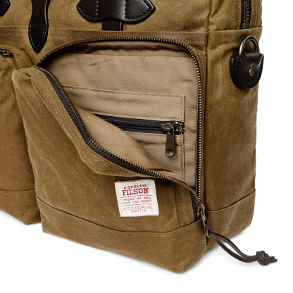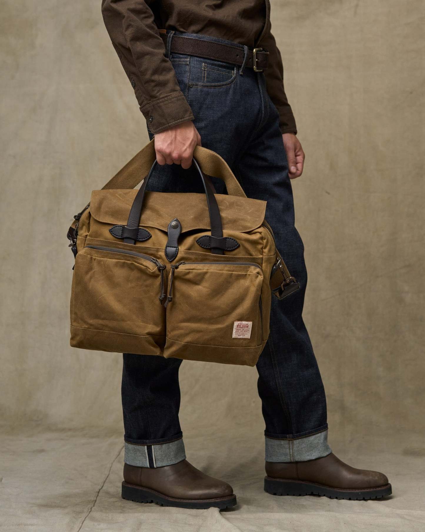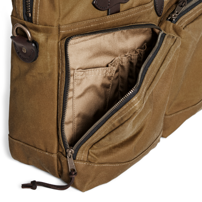 Our highest-capacity briefcase, the 24-Hour Briefcase combines the organizing ability of our Padded Computer Bag with the sleek design of our Original Briefcase. The waxed Tin Cloth material protects gear from foul weather and spray. This tightly woven canvas duck has been thoroughly saturated with wax for water resistance. The Bridle Leather handles are vegetable-tanned with tallows and wax added in the final stages, giving the leather a deep luster and lasting flexibility. The main zipper is solid brass from YKK? for a lifetime of rust-free operation. The interior is fully lined with unwaxed cotton, with a padded sleeve for laptops up to 15??��. Exterior zippered pockets have organization pockets inside. Rear trolley strap slides over luggage handles. Detachable, adjustable webbing shoulder strap.