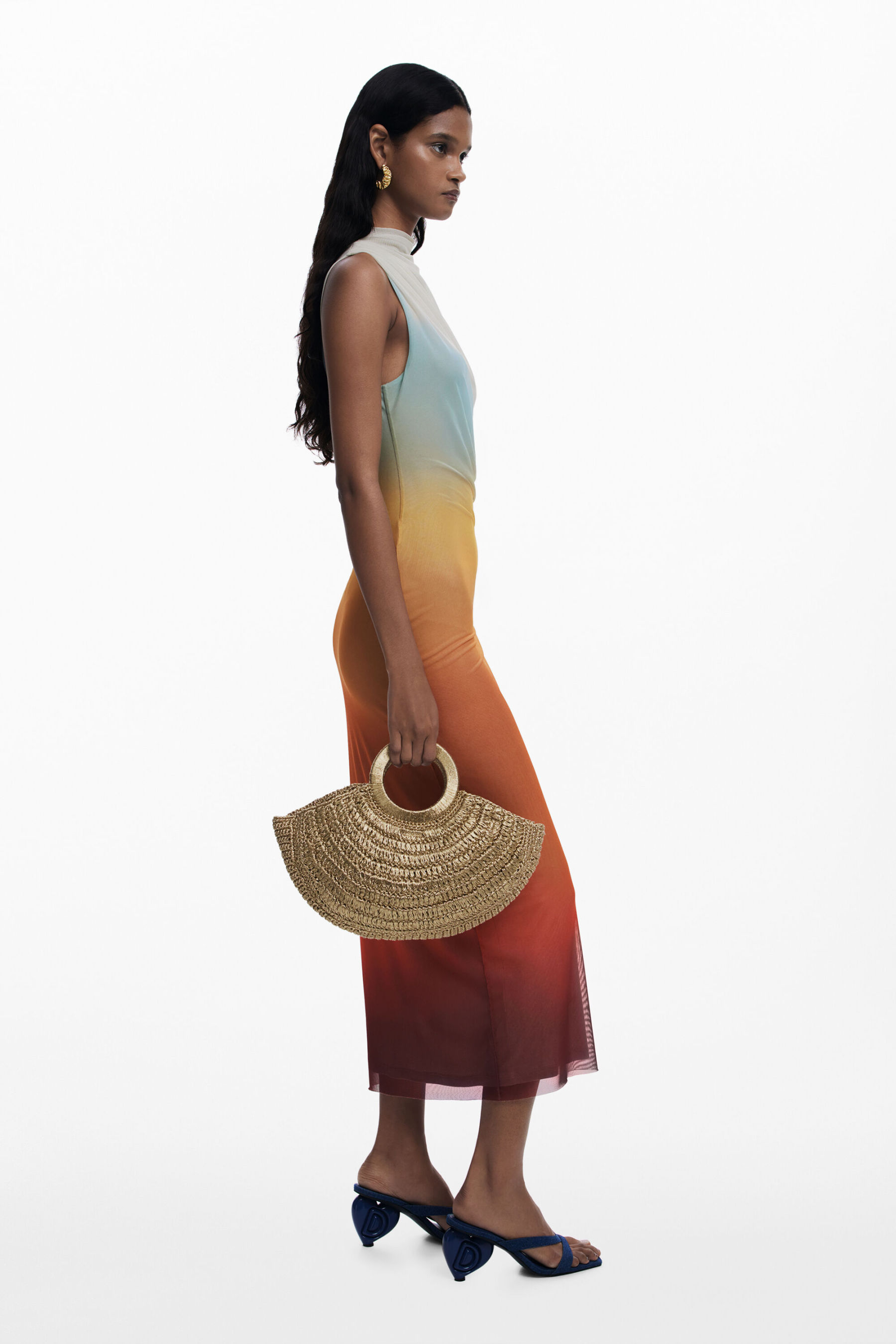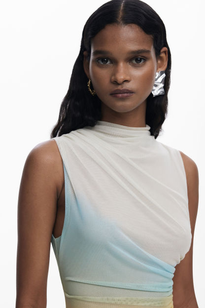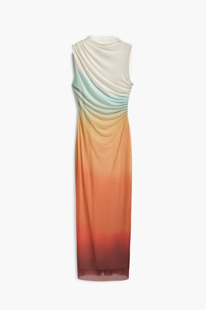 Midi dress in tulle, sleeveless, round neck and front draping with color gradient.