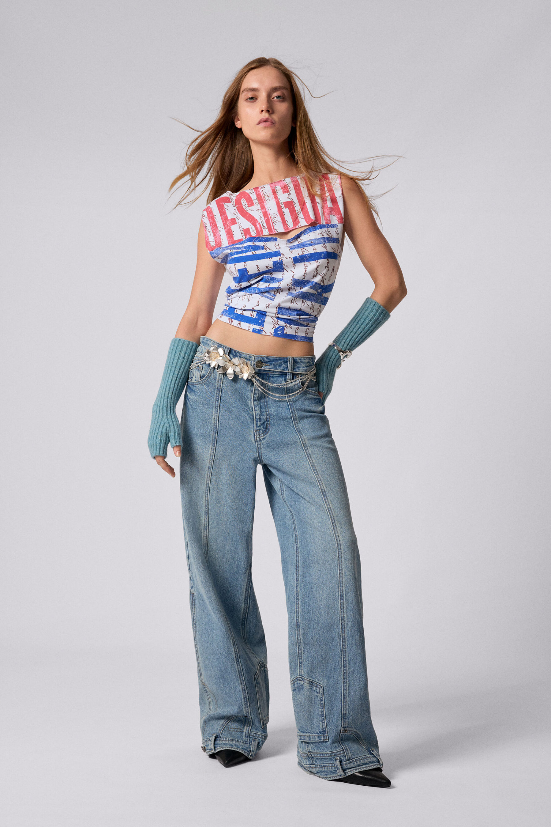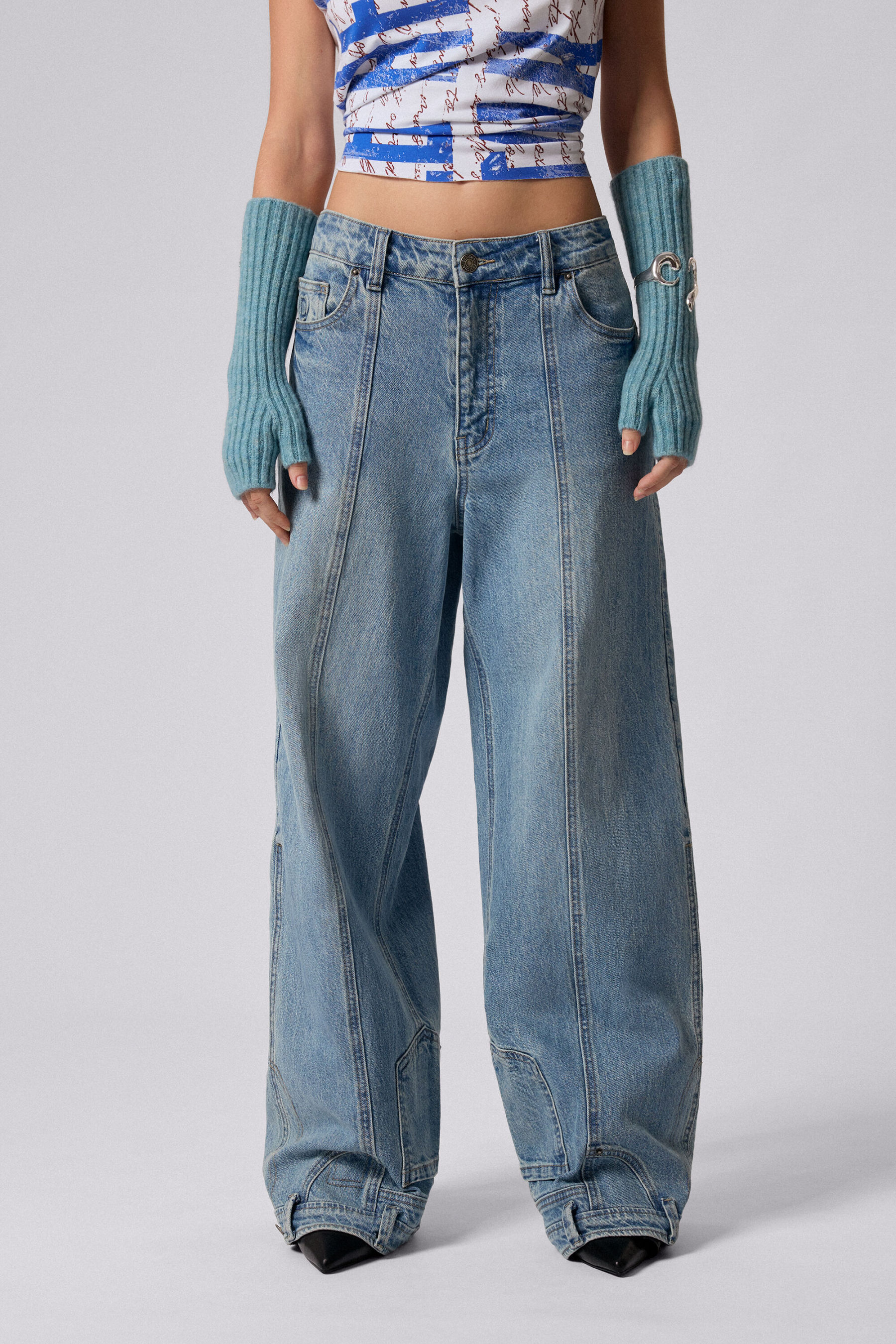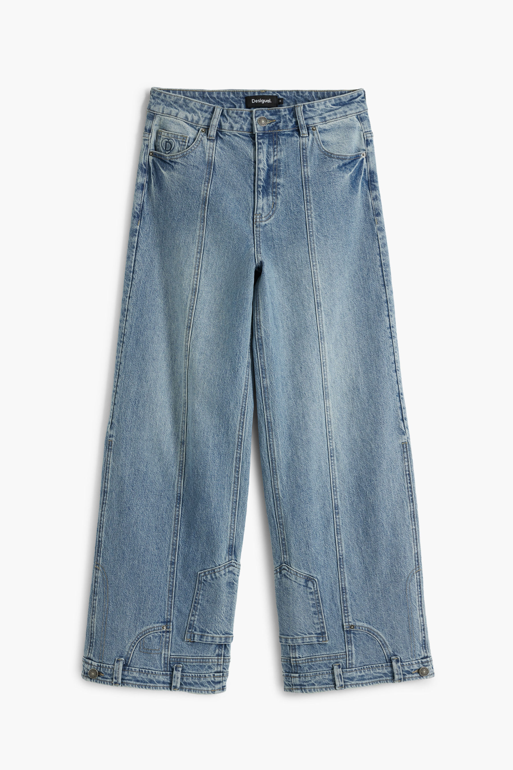 Light long denim trousers with a worn effect and inverted-effect details at the hems.
