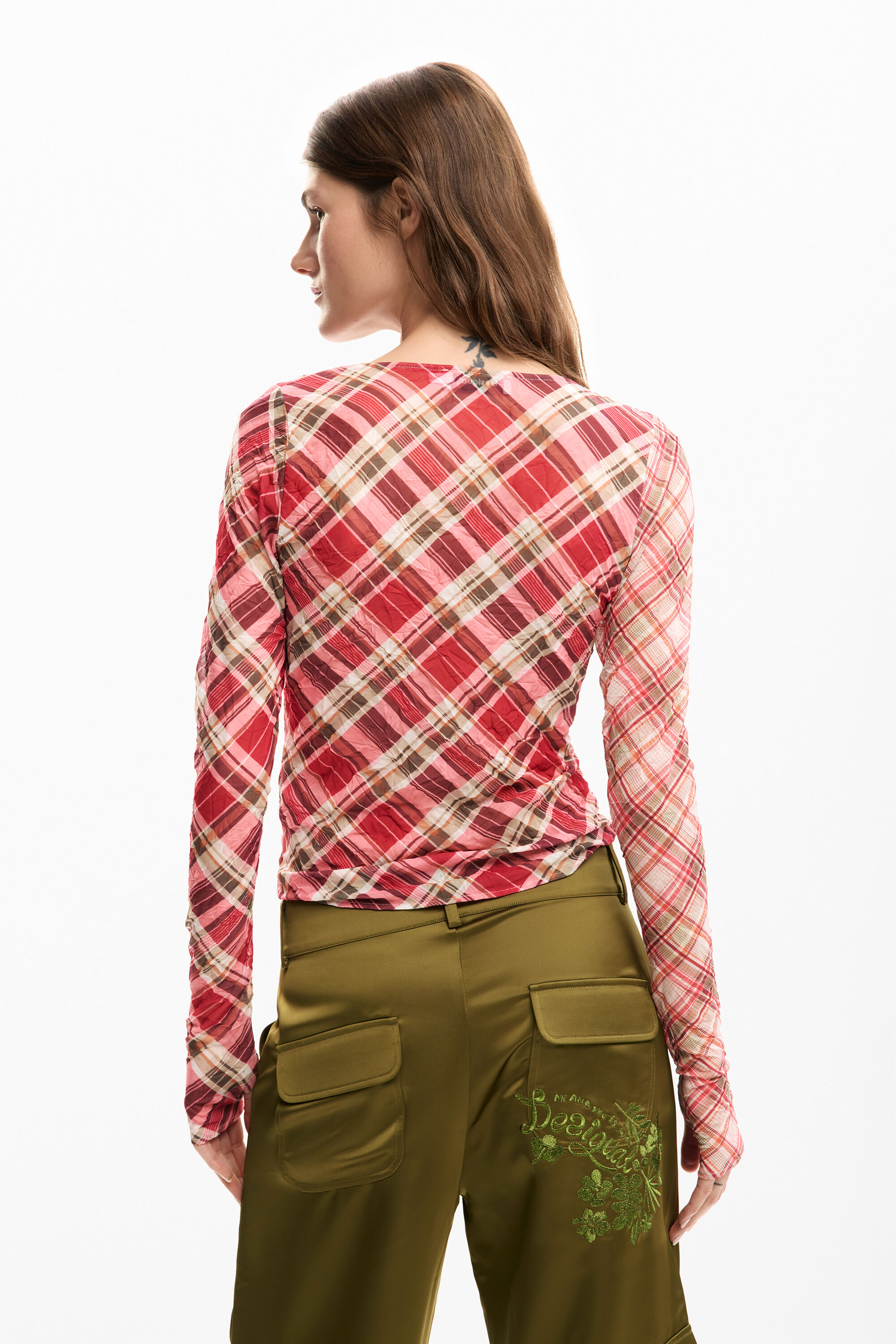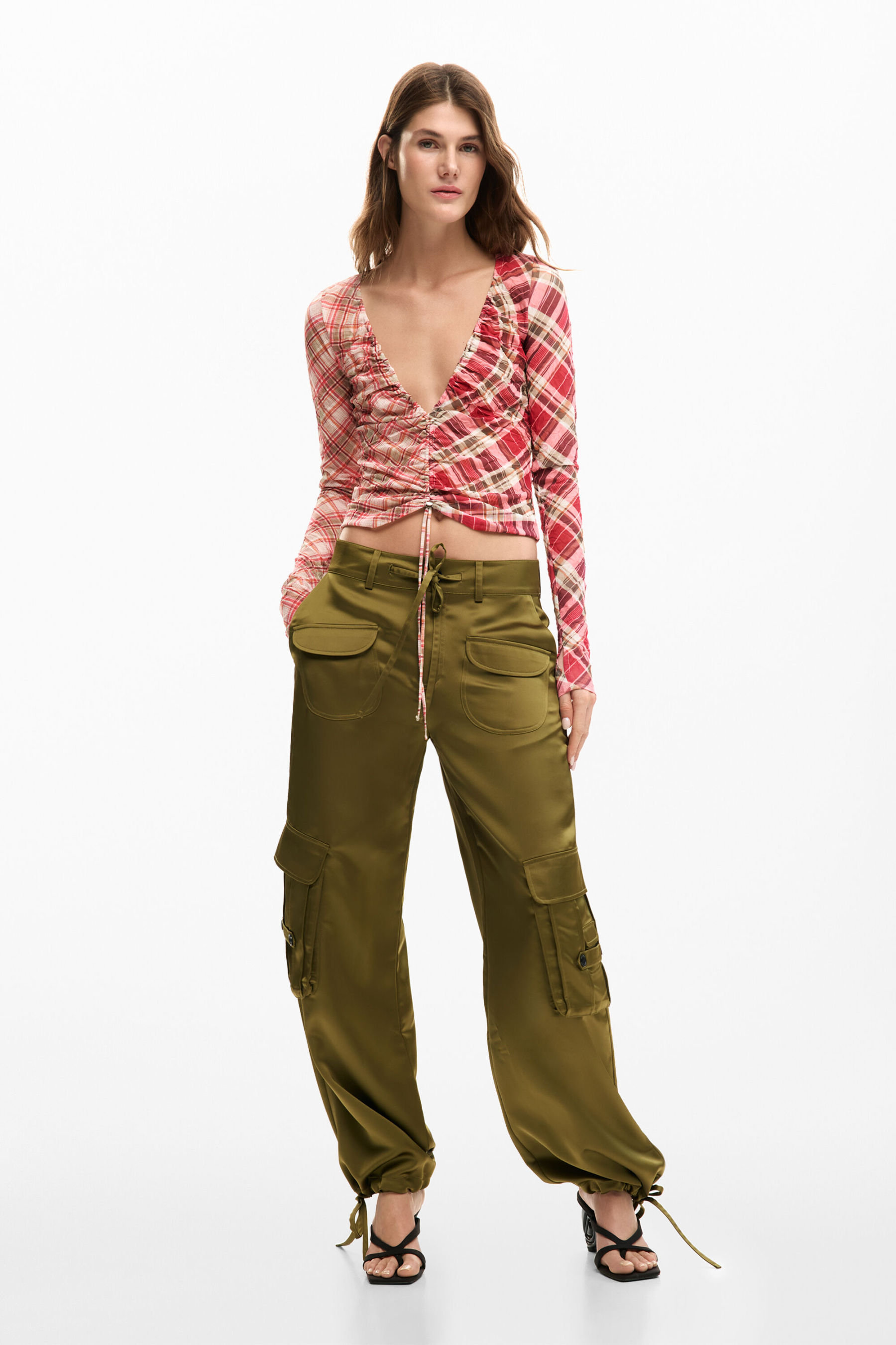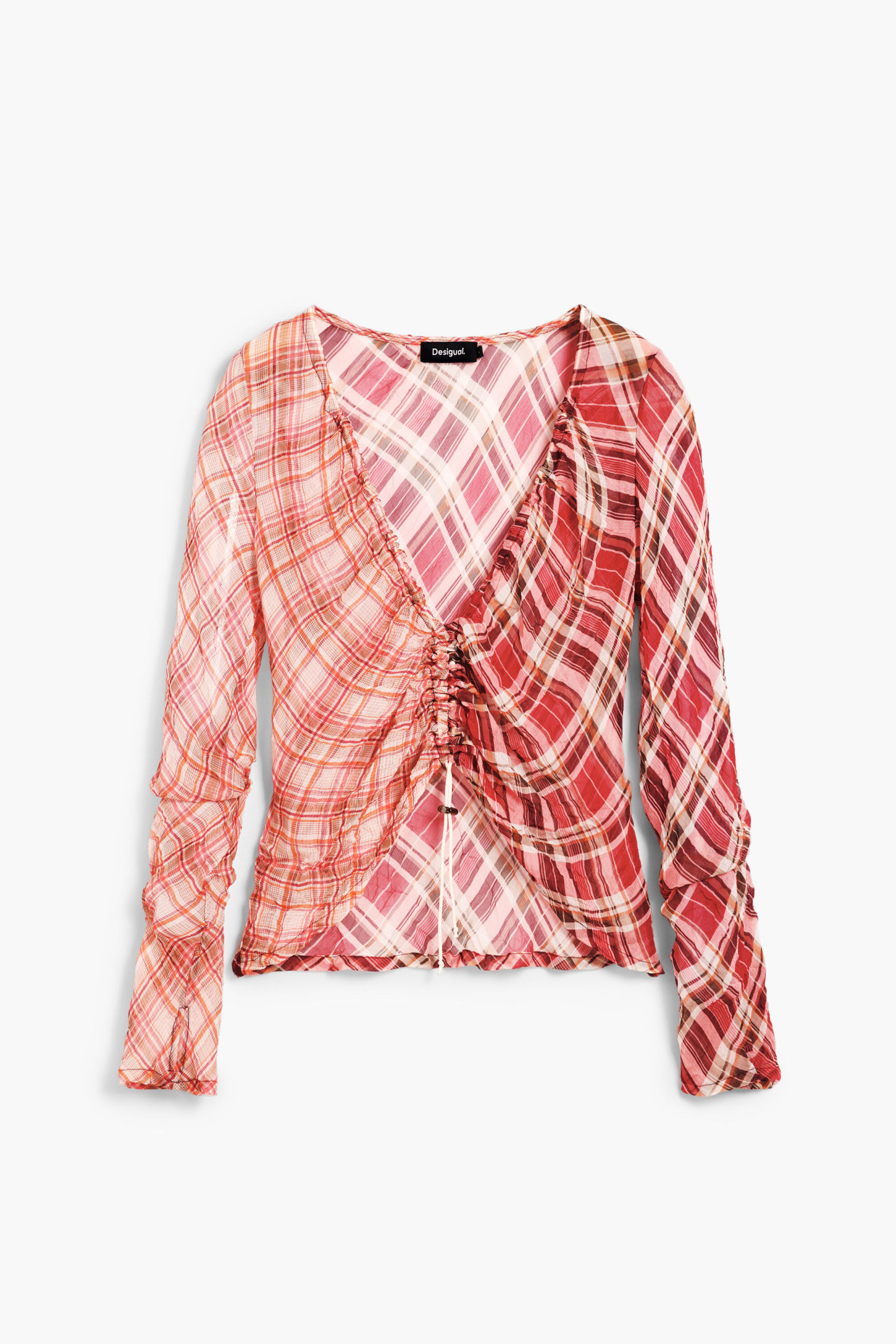 Checkered T-shirt with ruching on the front that adjusts the length and checkered print in different shades