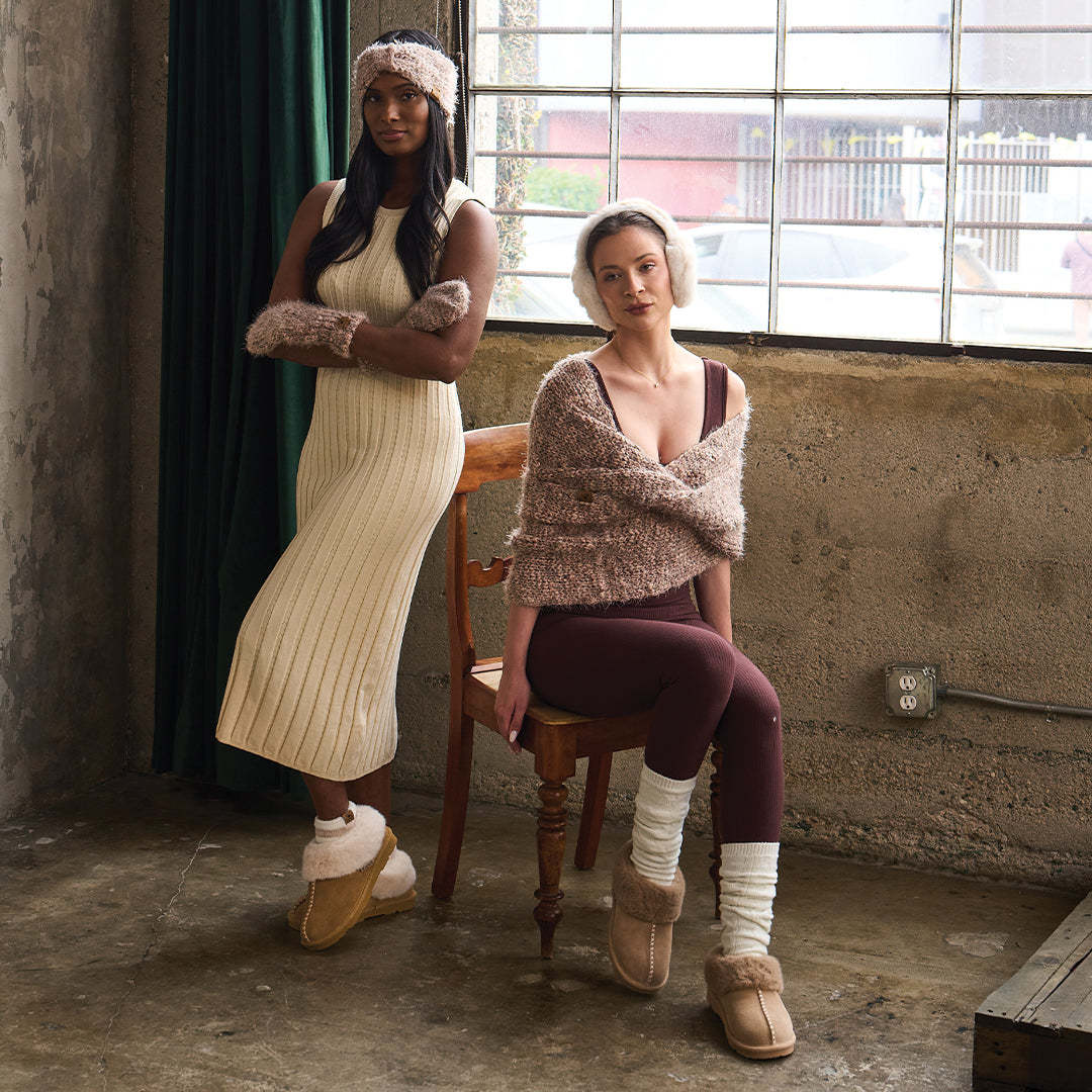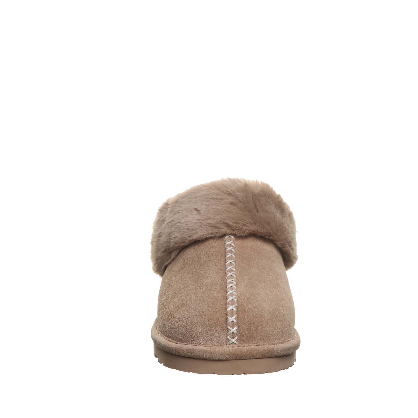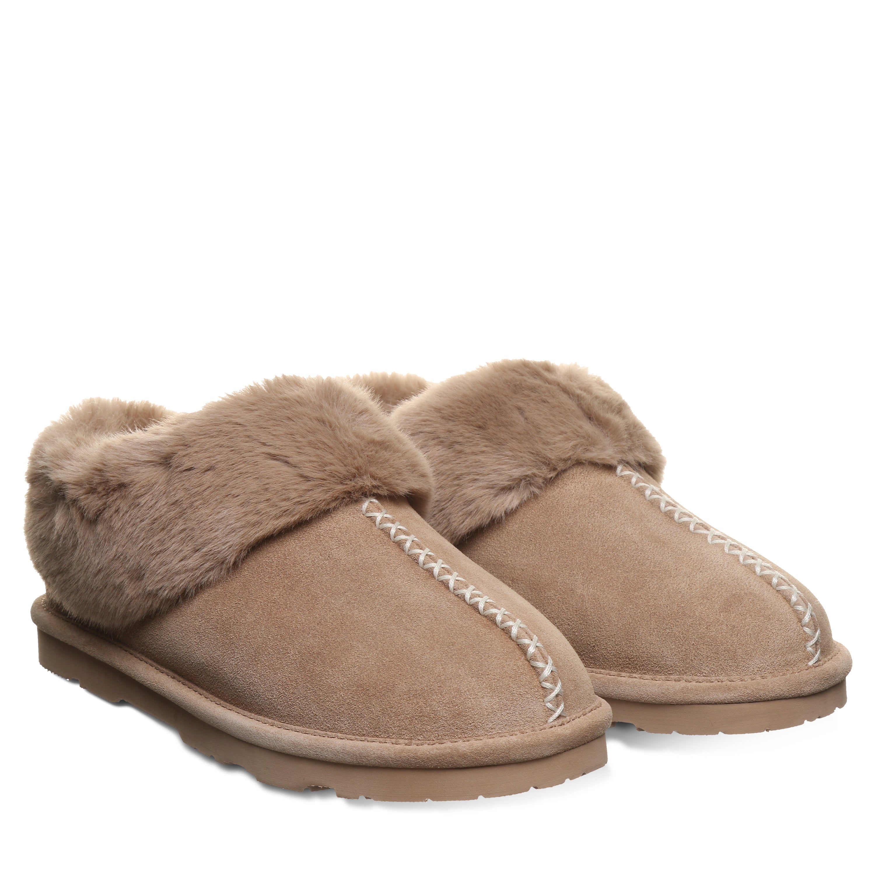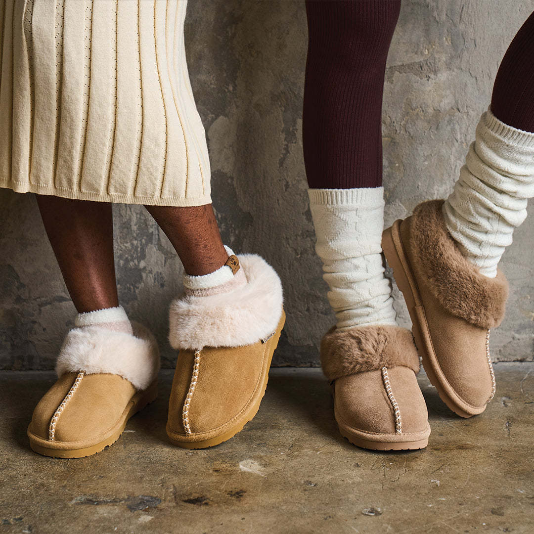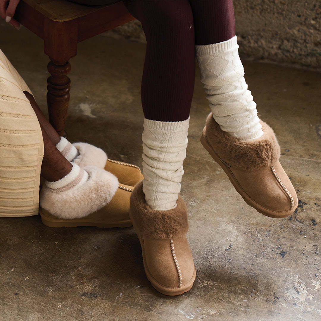 Warning: may cause serious slipper envy. Say hello to your new stay-home (or sneak out for coffee) favorite. Bella suede slippers wrap your feet in a dreamy faux fur that makes every step as cozy as laying on the couch. Top it off with a unique stitching detail for extra cuteness and a faux fur collar that makes even your pajama pants look put together!