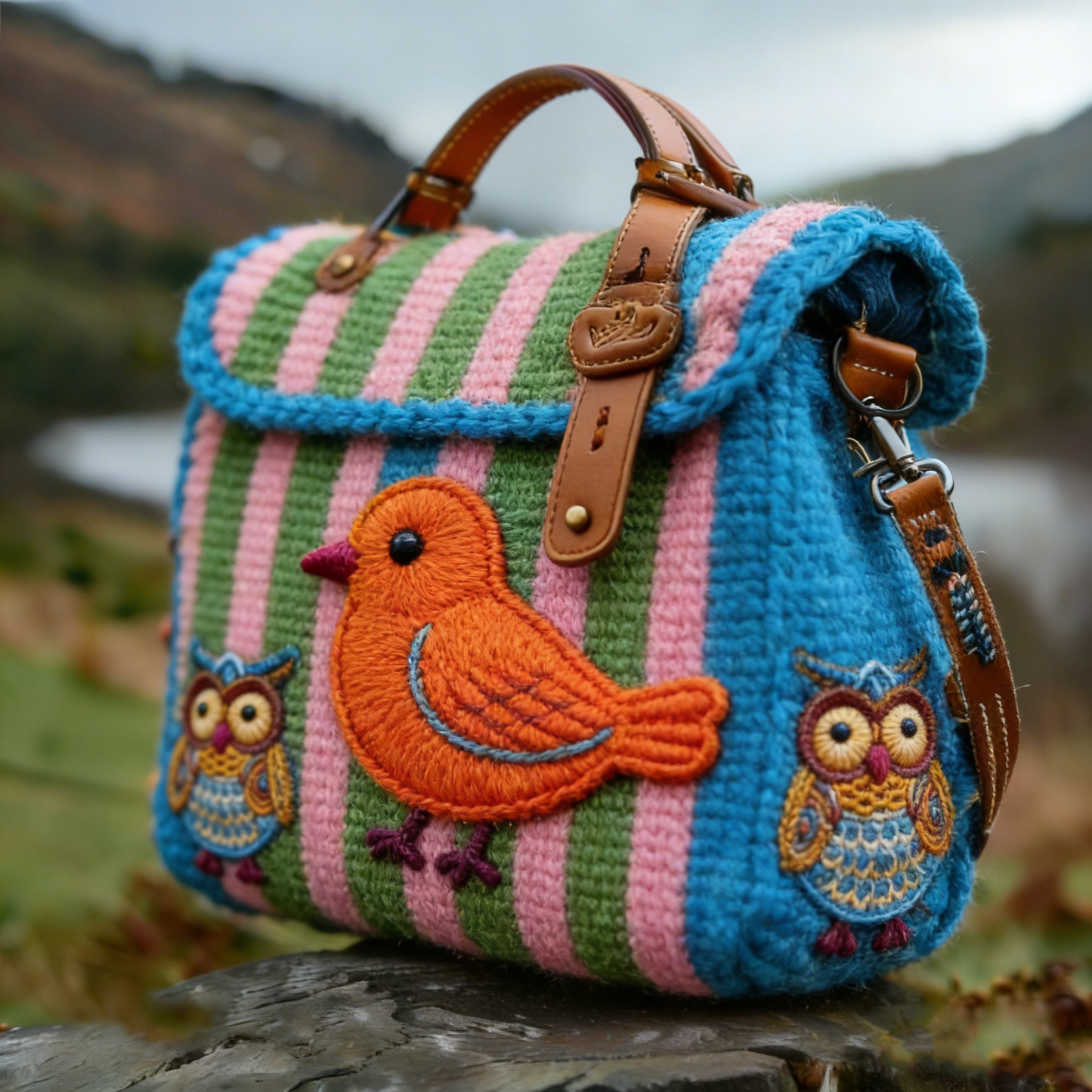 Blue Green Pink Striped Bird Owl Pattern Woven Crossbody Mini Handbag