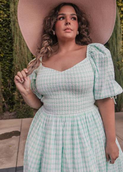 This darling dress has an effortless fit that makes it the ultimate look-cute-without-even-trying piece. From the sea-foam gingham print to the comfortable skirt, this dress has it all. Features a sweetheart neckline, smocked bodice, and lantern puff sleeves with adjustable ties. Ready for an adventure.