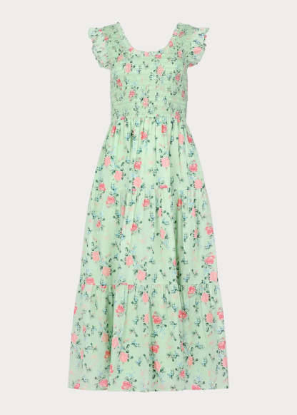 The Chloe Dress is a sweet smocked favorite, designed for carefree days and picture-perfect twirls. With delicate flutter sleeves, a tiered skirt, and soft floral prints, it��s available in three charming hues��green, yellow, and blue. The stretchy bodice ensures all-day comfort while adding a touch of vintage charm. Whether she��s picking wildflowers or playing in the sunshine, Chloe is made for making memories.