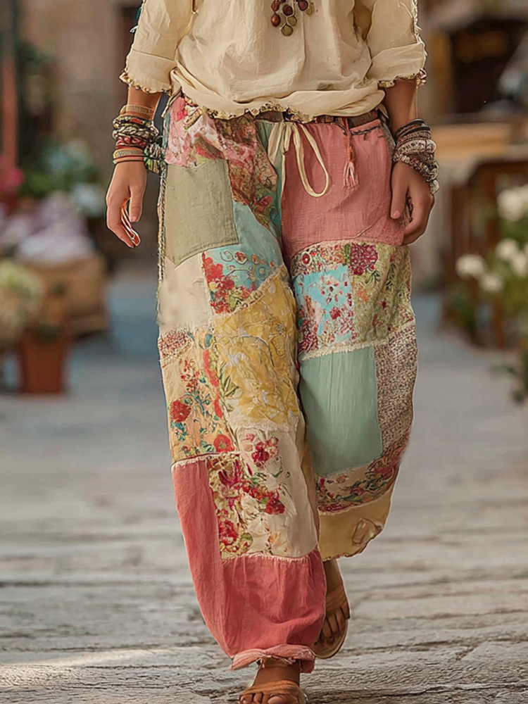 Classic Retro Rose And Floral Patchwork Art Linen Pants
