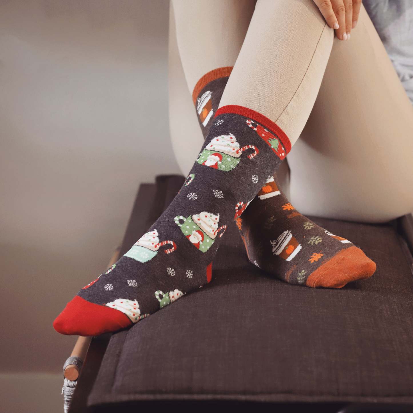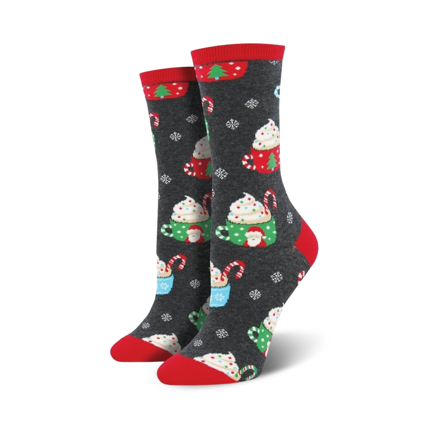 Who needs a white Christmas when you can wear a Cocoa Christmas? These gray socks have red and green candy canes, white snowflakes, and Santa hats with white pom poms. Oh, and don't forget about the dark brown cocoa mugs with white whipped cream and green and red sprinkles. Cocoa Christmas socks are perfect for spreading holiday cheer, even if it's just from your toes!