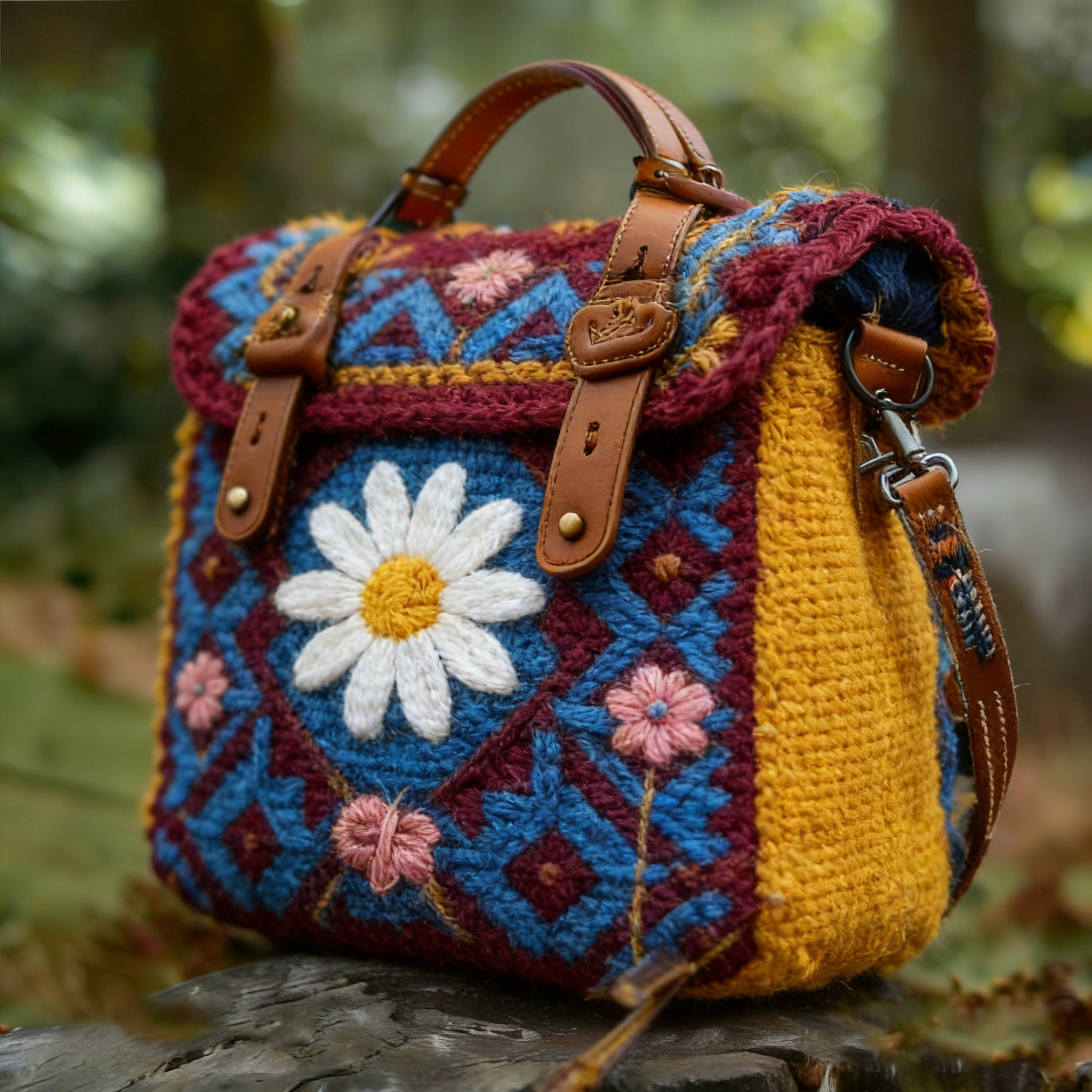 Colorful Geometric Daisy Pattern Woven Crossbody Mini Handbag