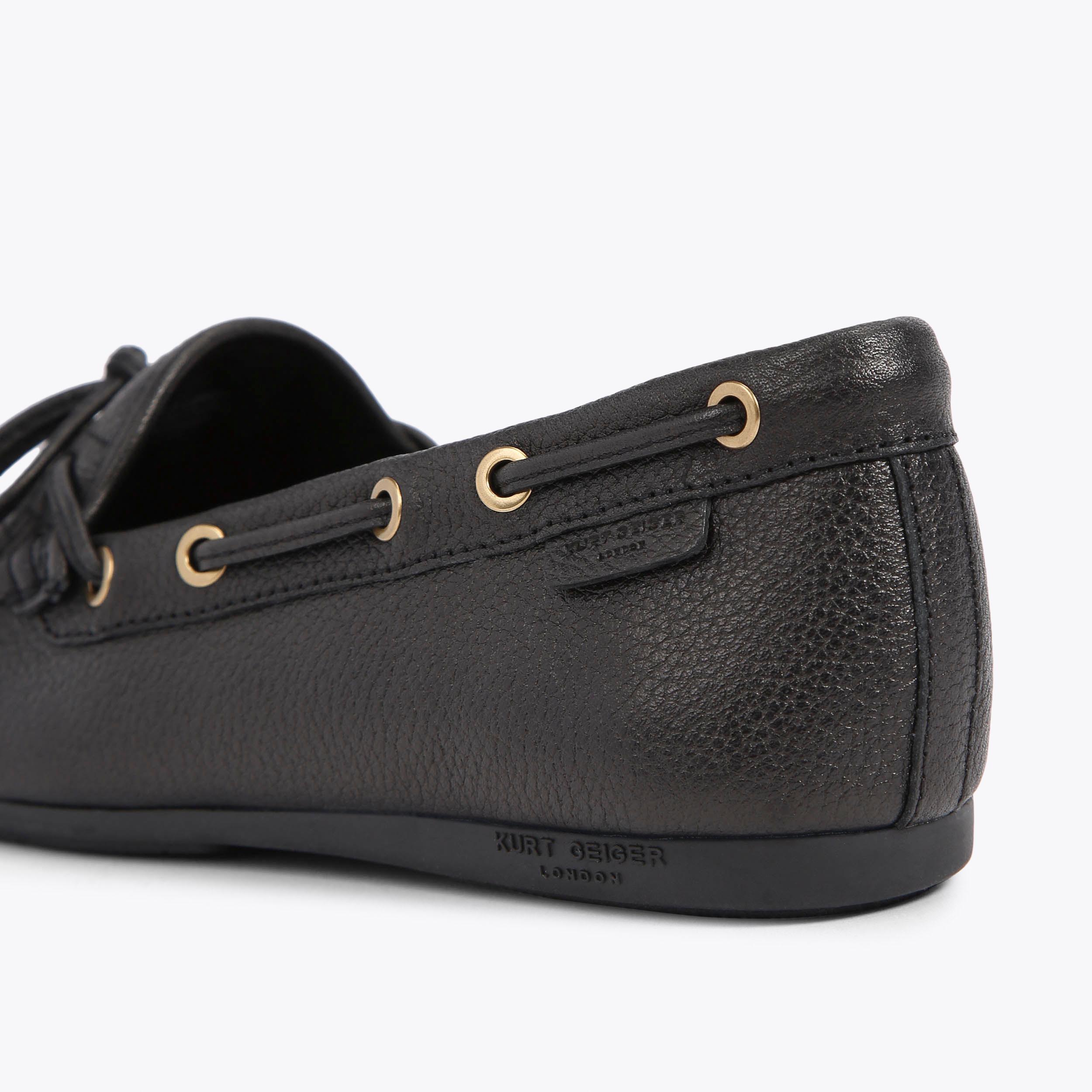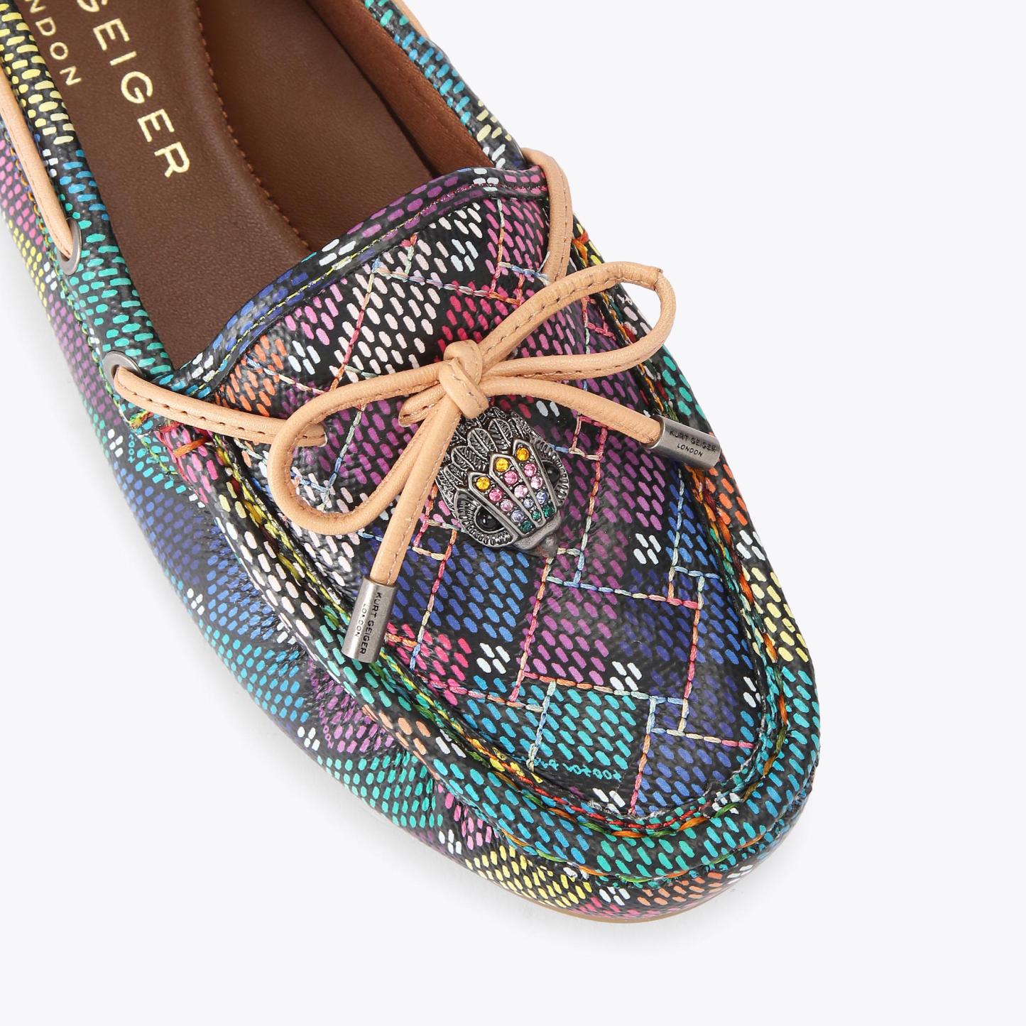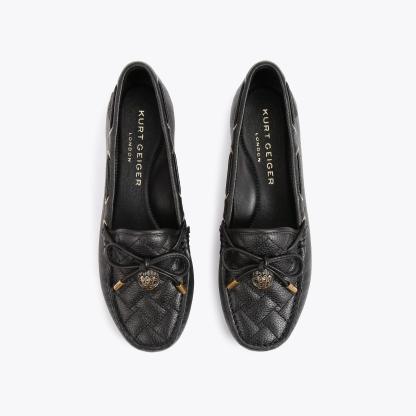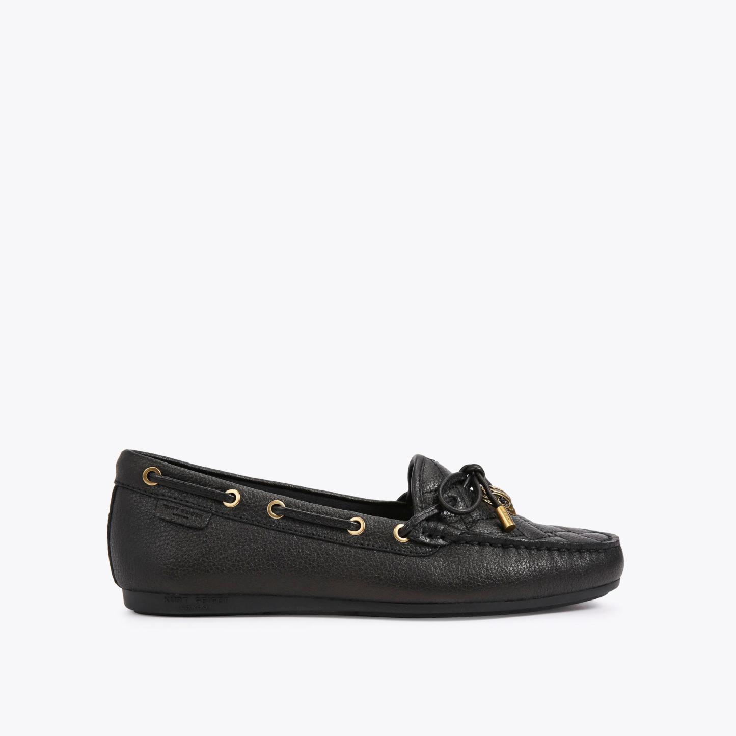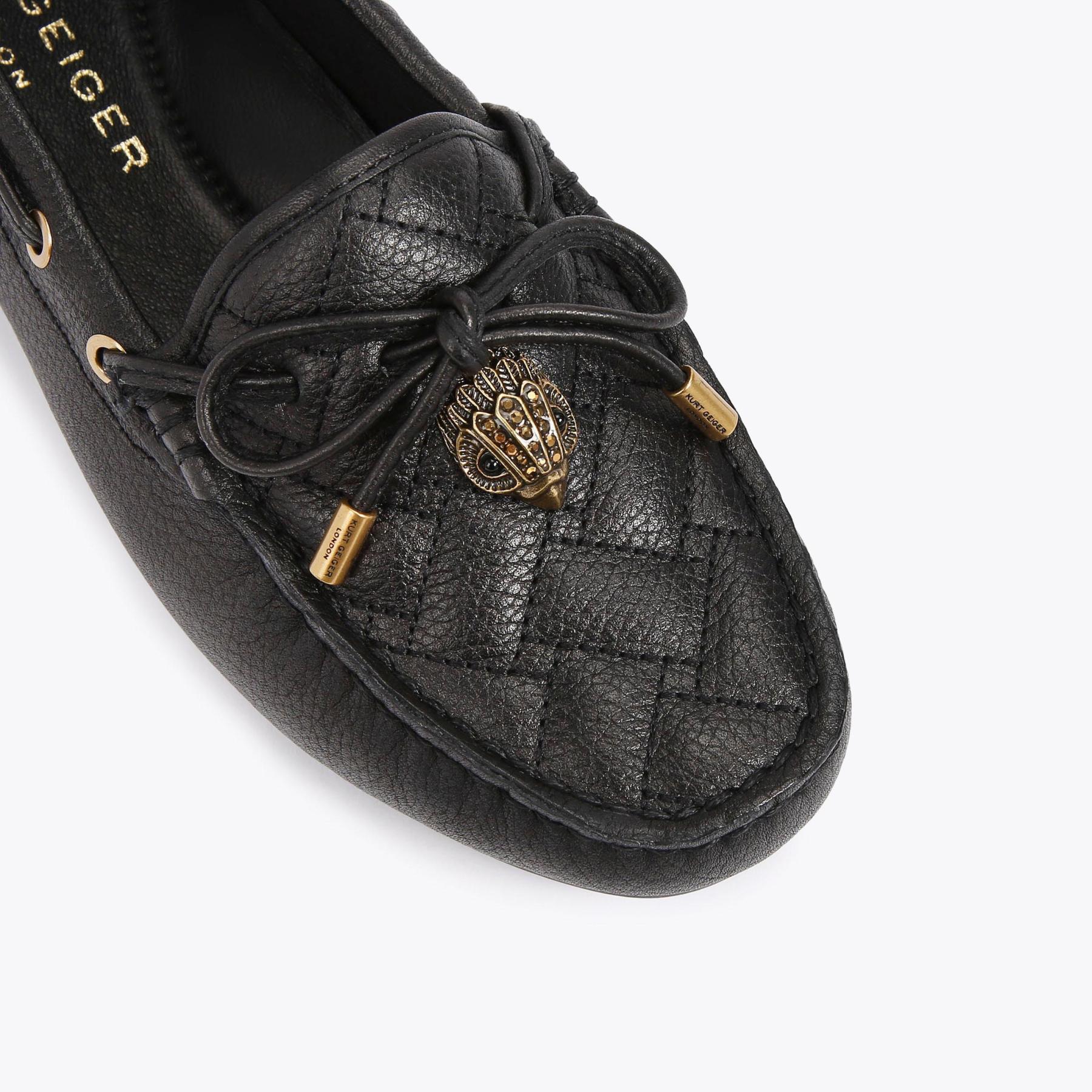 The Eagle Moccasin is a slip on loafer. The upper is crafted from a black pebble grain leather panels with monogrammed Kensington weave design. There is a bow with antiqued silver eagle on each toe.