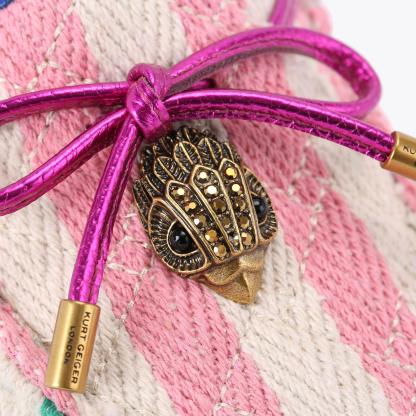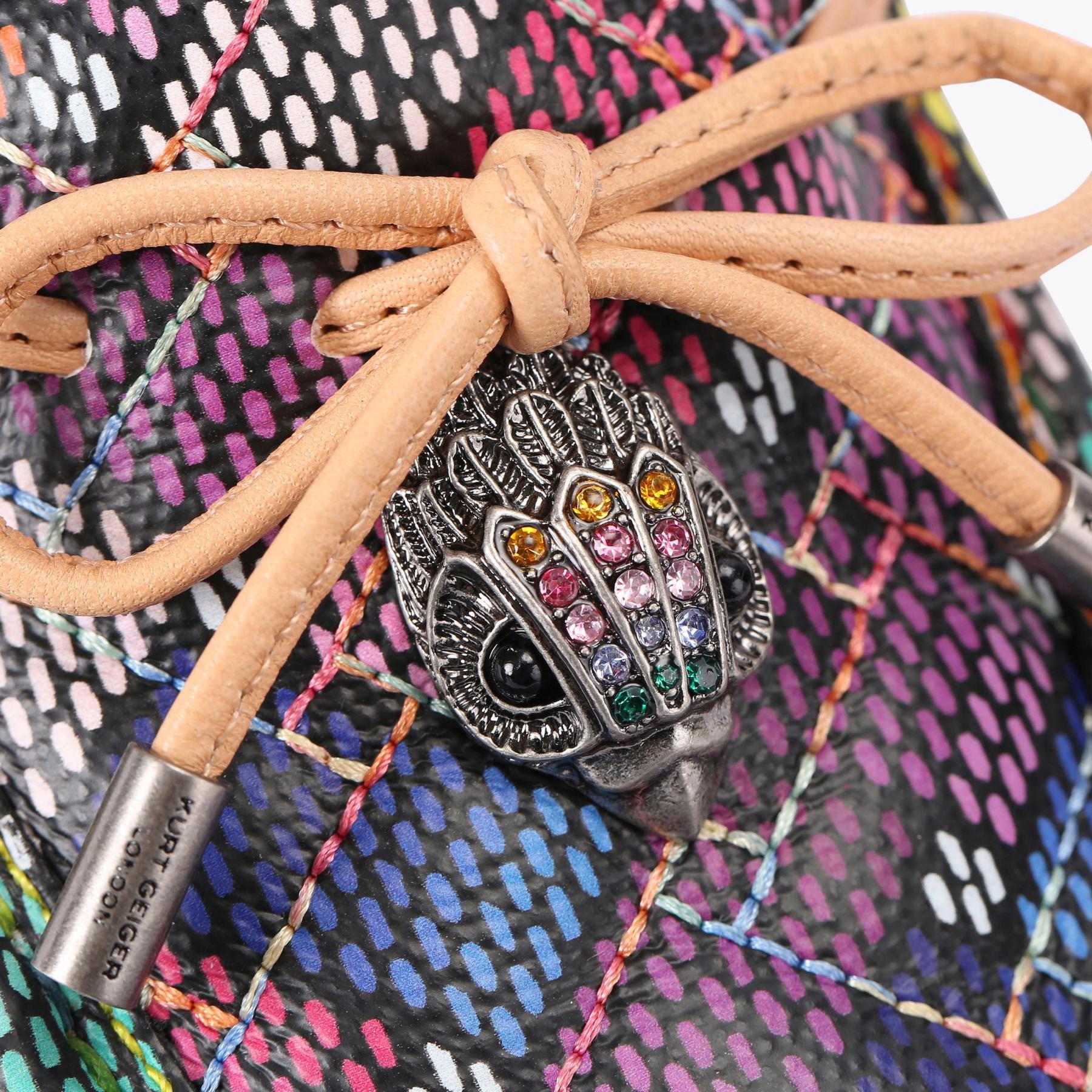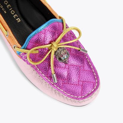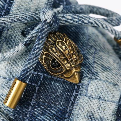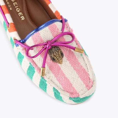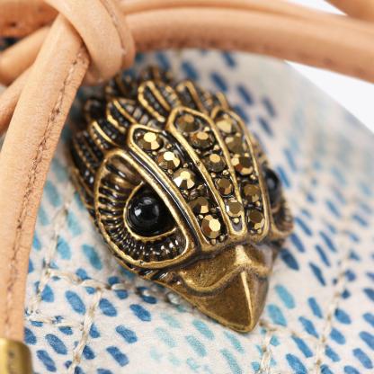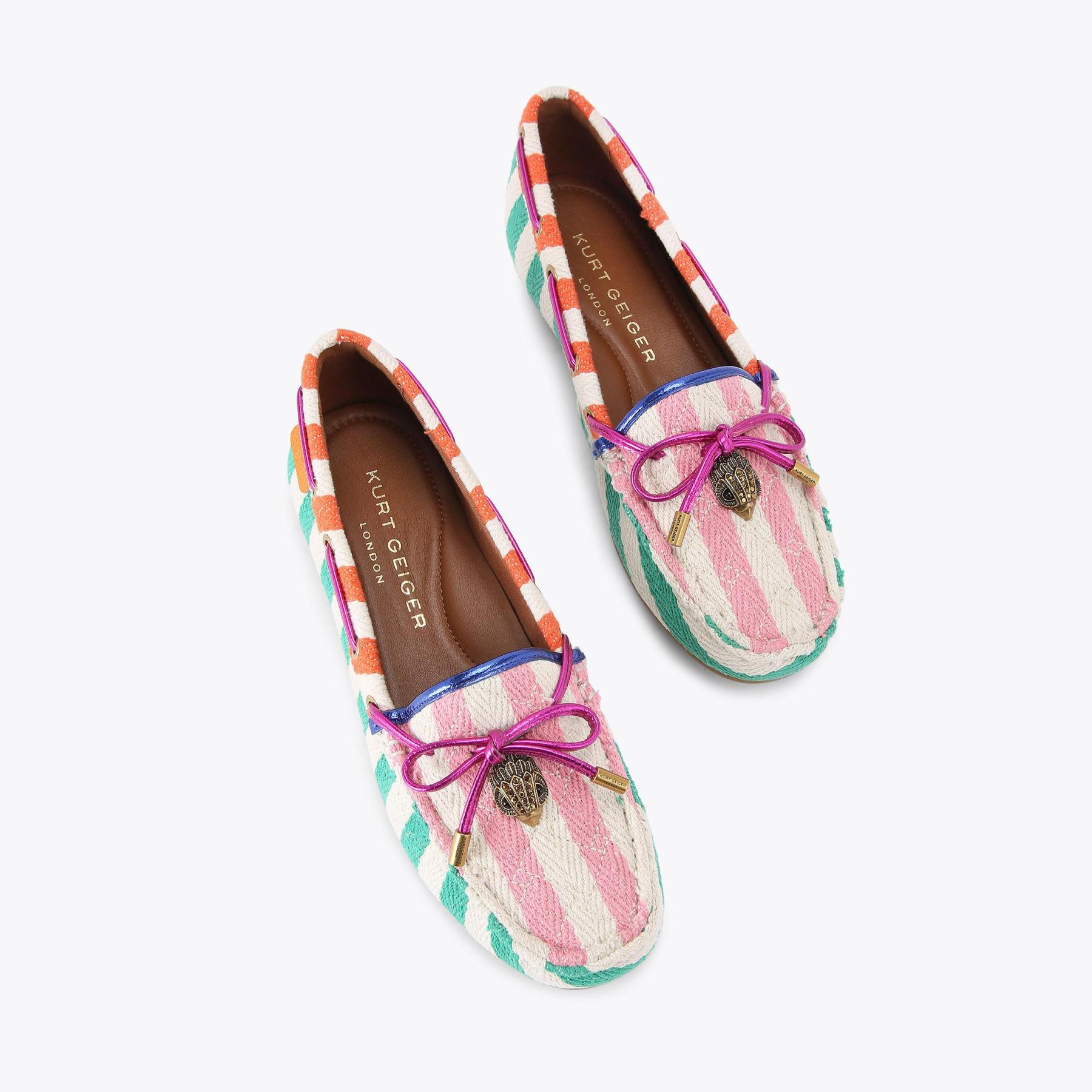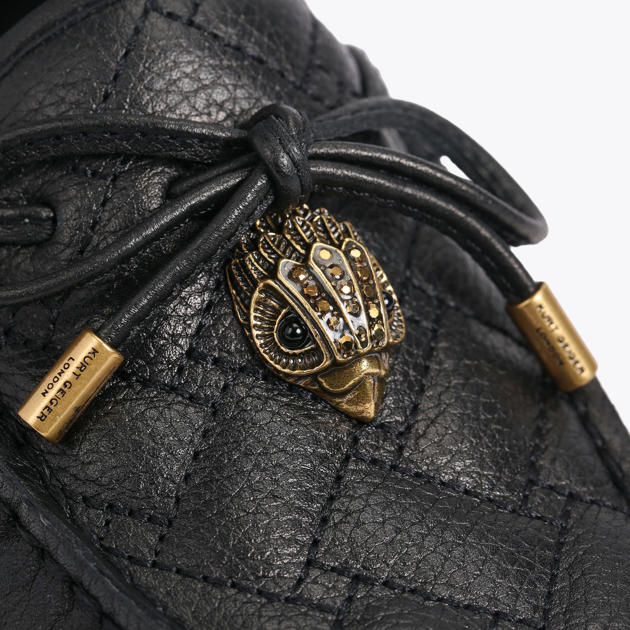 The Eagle Moccasin is a slip on loafer. The upper is crafted from a black pebble grain leather panels with monogrammed Kensington weave design. There is a bow with antiqued silver eagle on each toe.