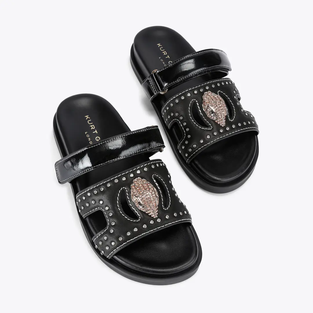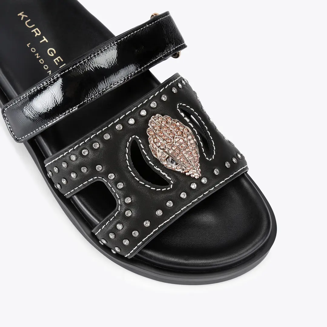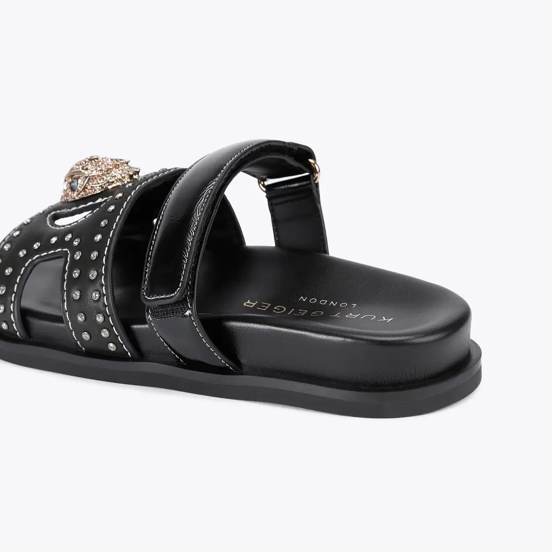 This Eagle Cut Out Sandal is crafted from a black leather. There is a thinner velcro strap across the foot as well as a wide strap across the toe with crystals. There is a gold crystal embellished eagle head sat on the strap.