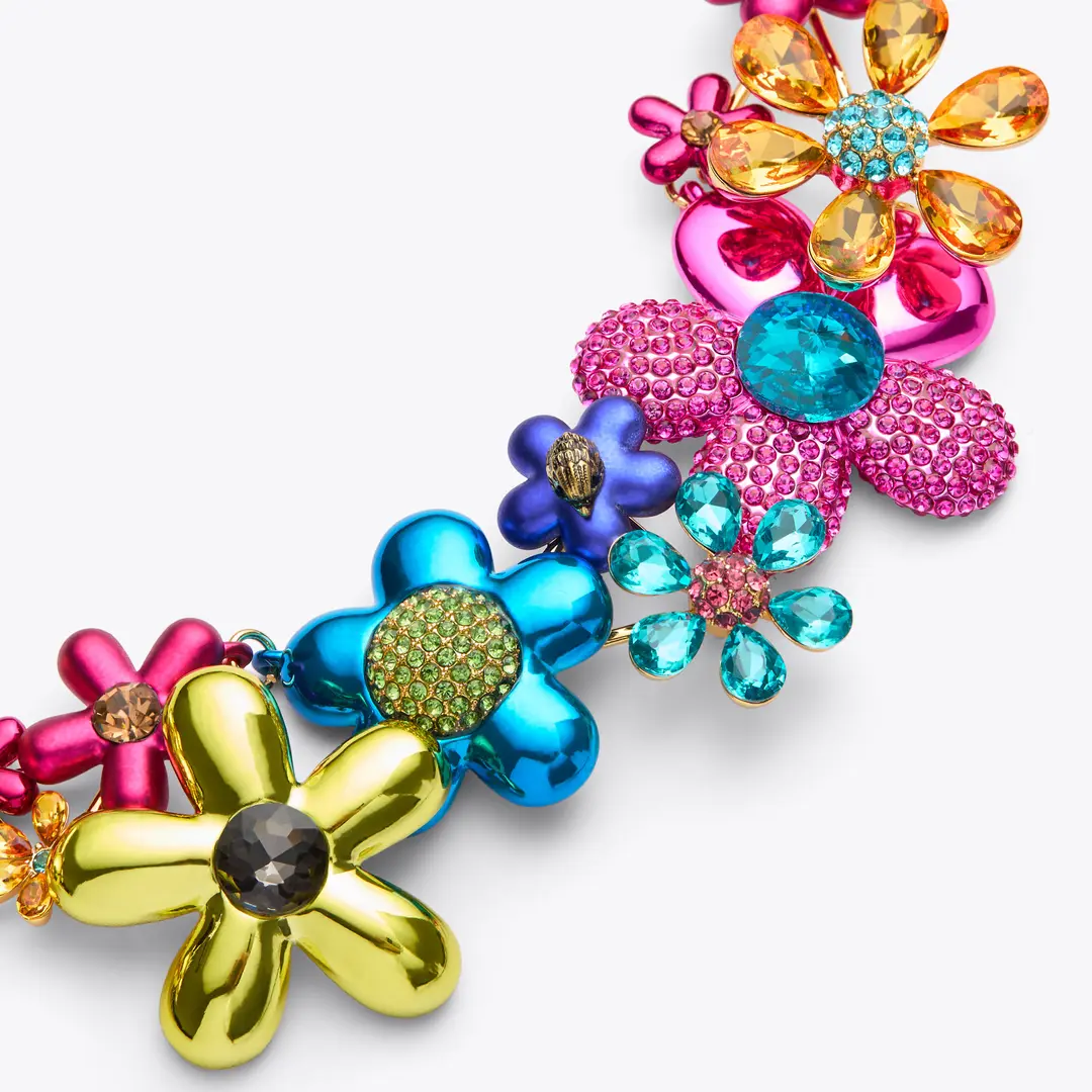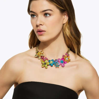 The Extra Large Rainbow Floral Collar Necklace features a gold chain which is embellished with multi-color crystal studded flowers . One flower is topped with micro Eagle head in antiqued bronze.