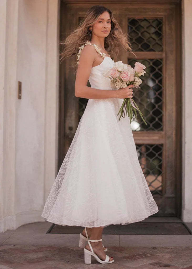 The JessaKae Phiona Dress blends timeless charm with delicate floral embroidery across a flowing silhouette. With whimsical green floral straps and a structured bodice, this dress is perfect for weddings, formal events, or garden parties. Pair with heels and subtle jewelry for a graceful, statement-making look.