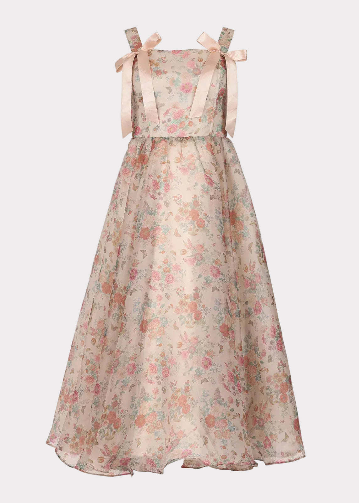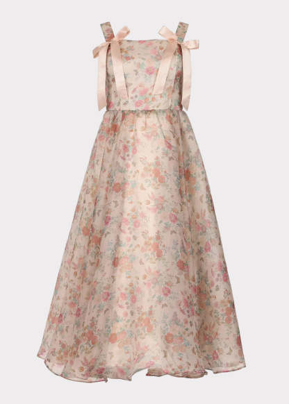 The Francesca Dress is pure enchantment in soft blush tones and dreamy florals. Crafted from a delicate organza overlay, it features silky satin bow-tie straps and a full, floaty skirt made for magical twirls. Subtle butterflies and pastel blooms bring a storybook charm to every detail. Ideal for flower girls, special occasions, or her next fairy tale moment.