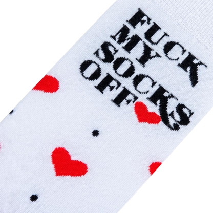 Sneak into a sassy style that'll make your feet do a sock dance! "Fuck My Socks Off" socks serve a side of cheekiness with a blush of red hearts and a sprinkle of black polka dots. These crew-length socks are guaranteed to turn your feet into the life of the party.