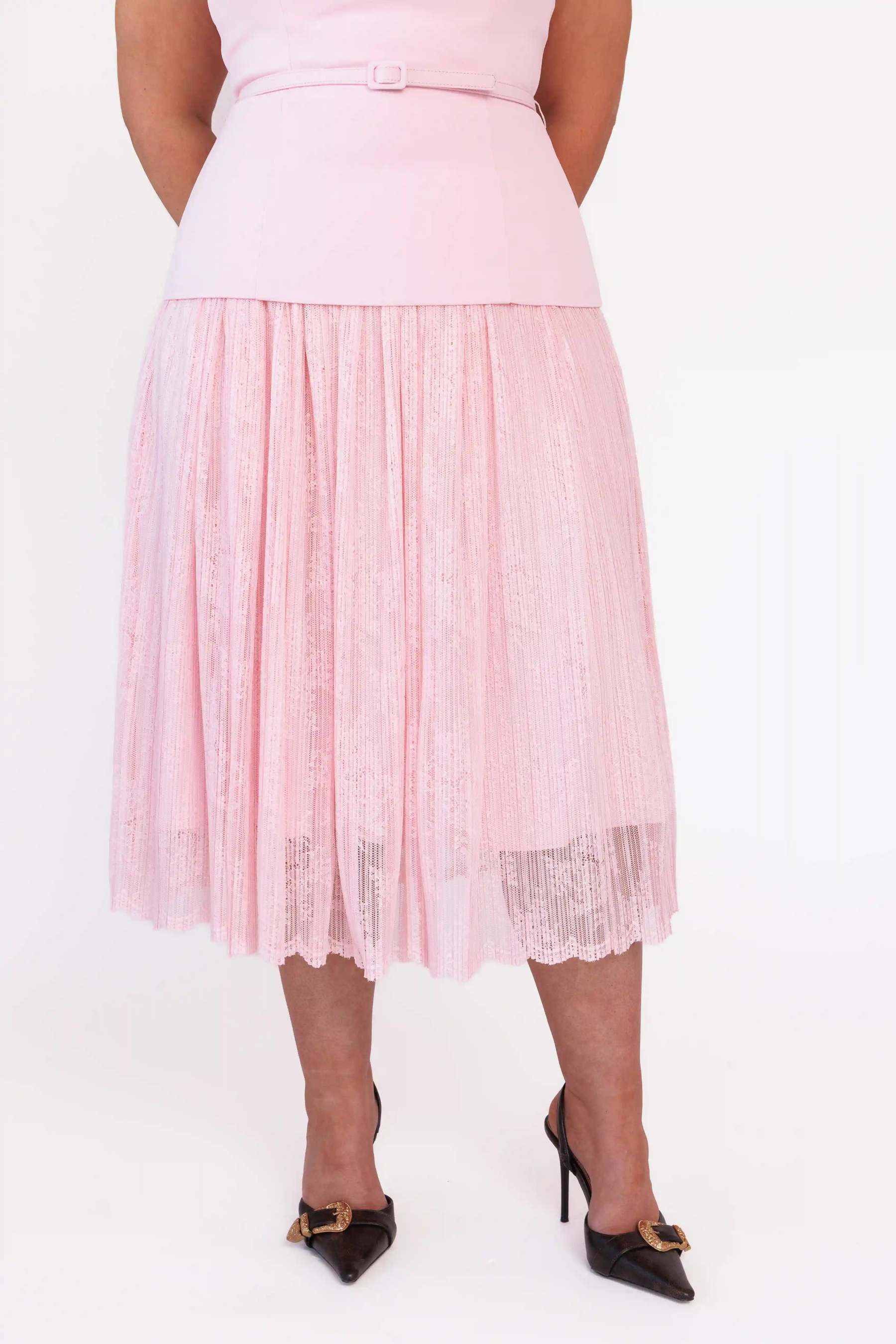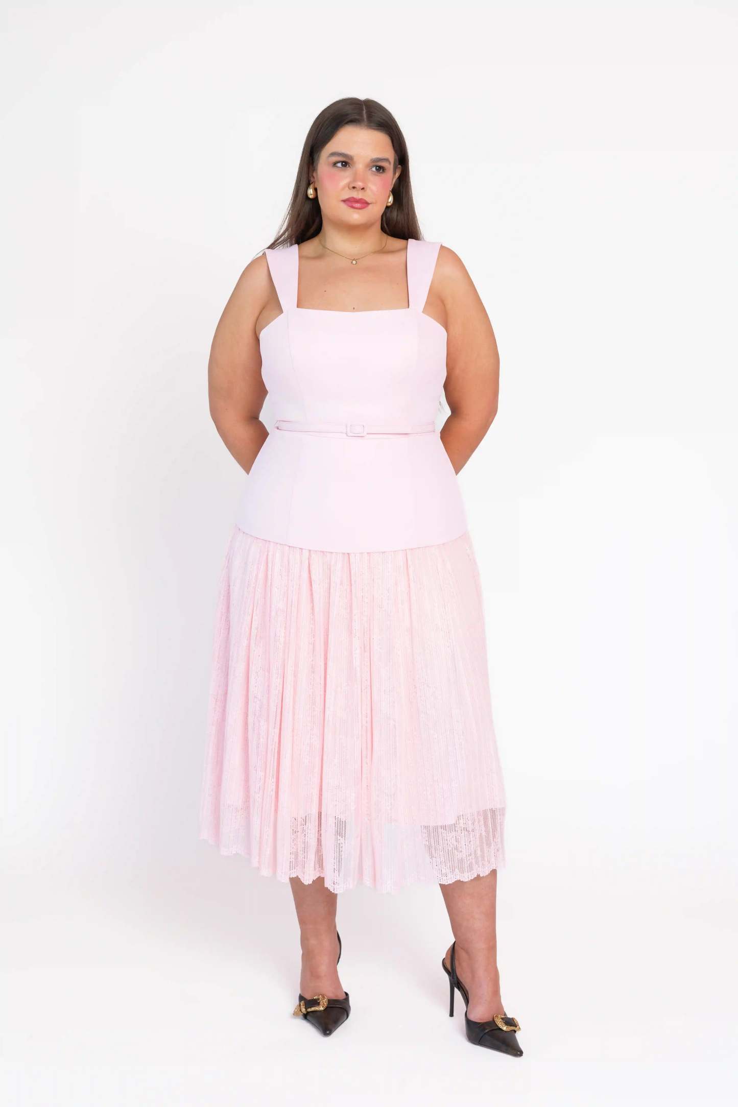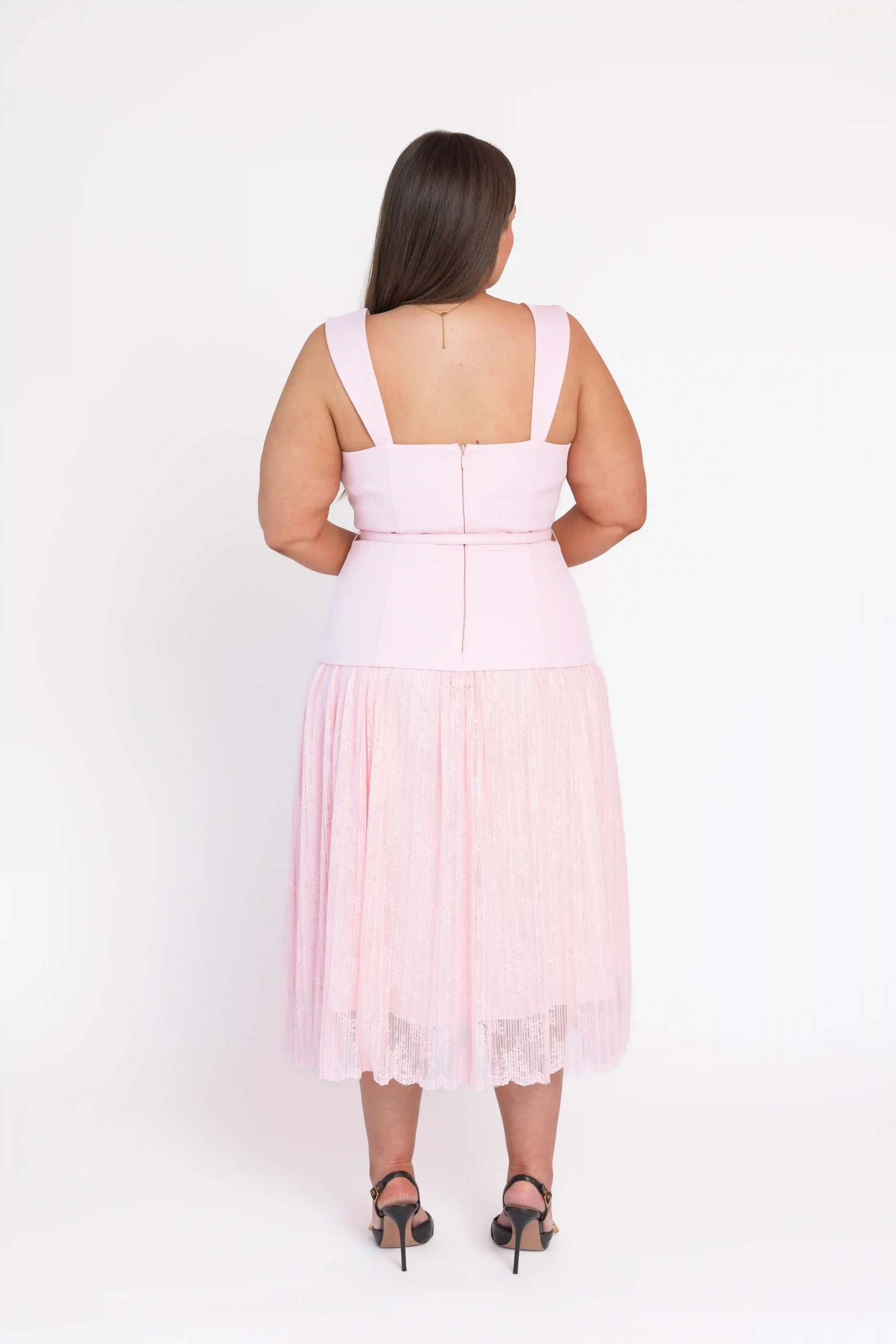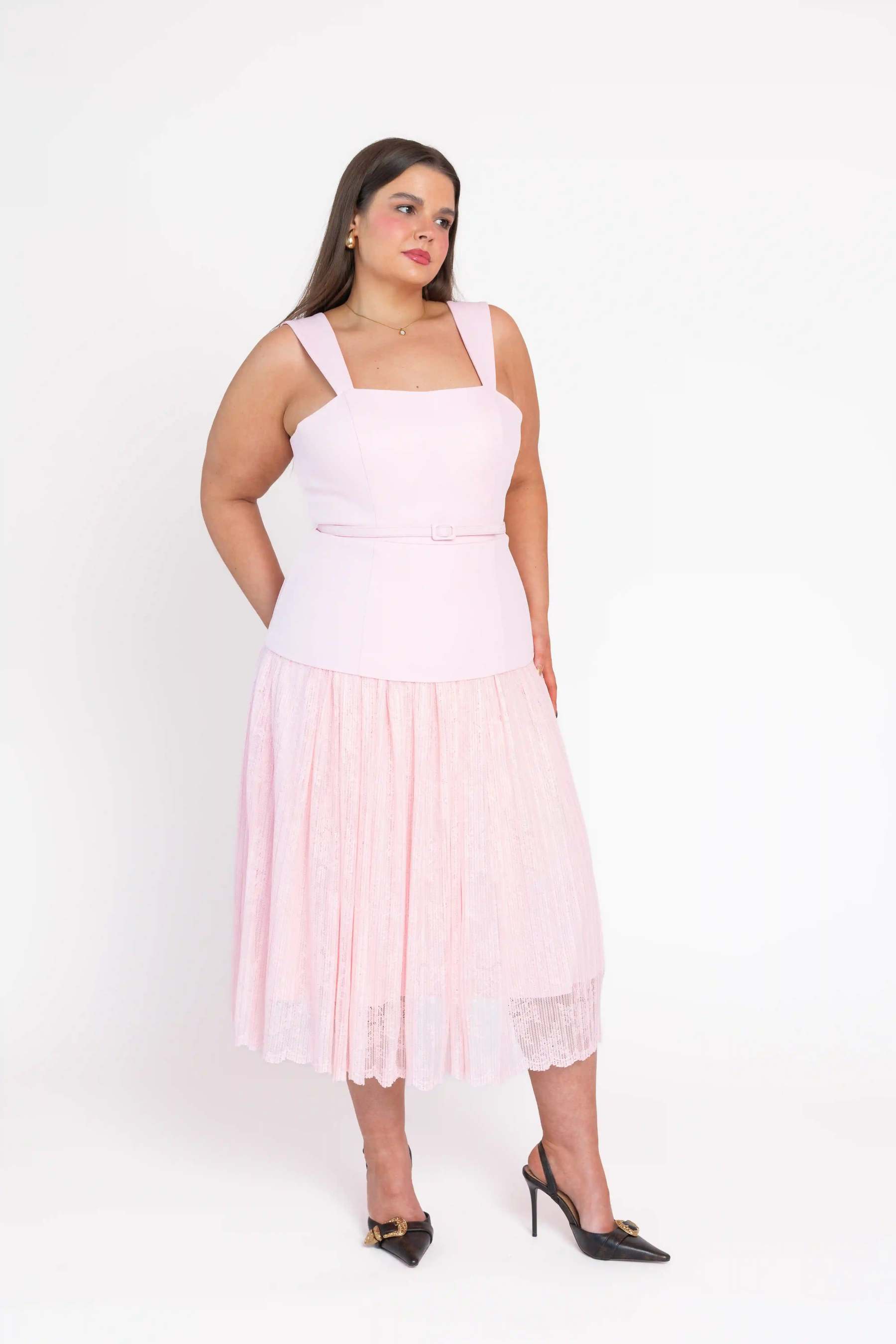 A midi-length dress in soft pink with a square neckline and wide-to-narrow supportive straps. A layered bodice rests over the lace skirt, with a matching removable belt defining the waist for a polished, feminine silhouette.?For a similar color palette check out?