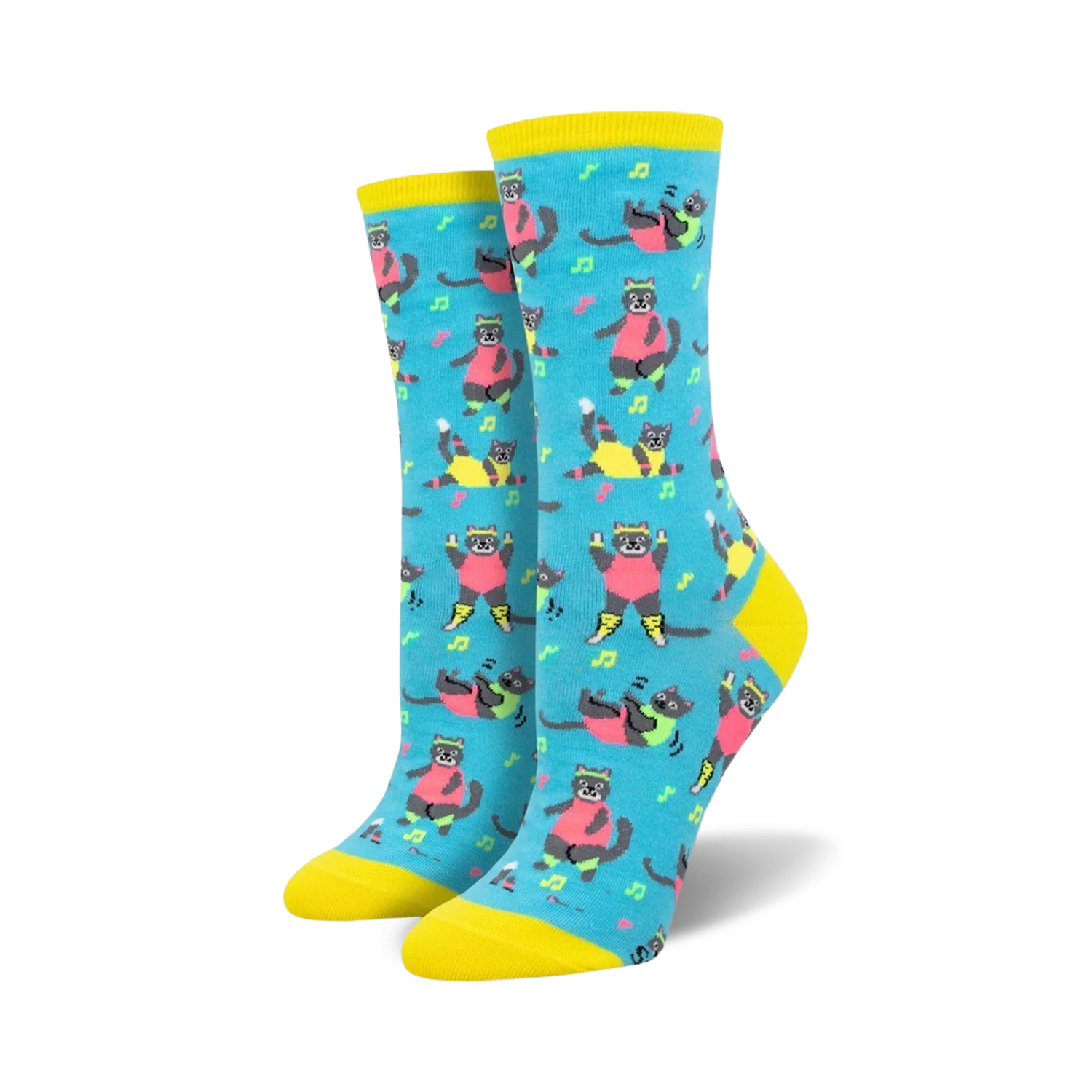 Unleash your inner feline aerobics queen with these Jazzercise Cats socks! Picture this: a crew of cartoon cats rocking leg warmers and busting a groove amidst musical notes. The bright yellow toe and heel, paired with the vibrant blue cuff and cuff, will make your feet the center of attention. These socks are perfect for adding some fun and energy to your workout wardrobe. Who said exercise can't be purr-fectly fashionable?