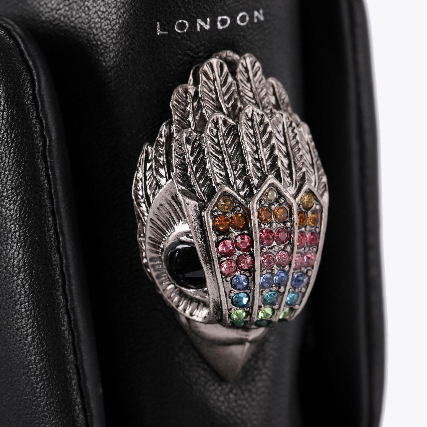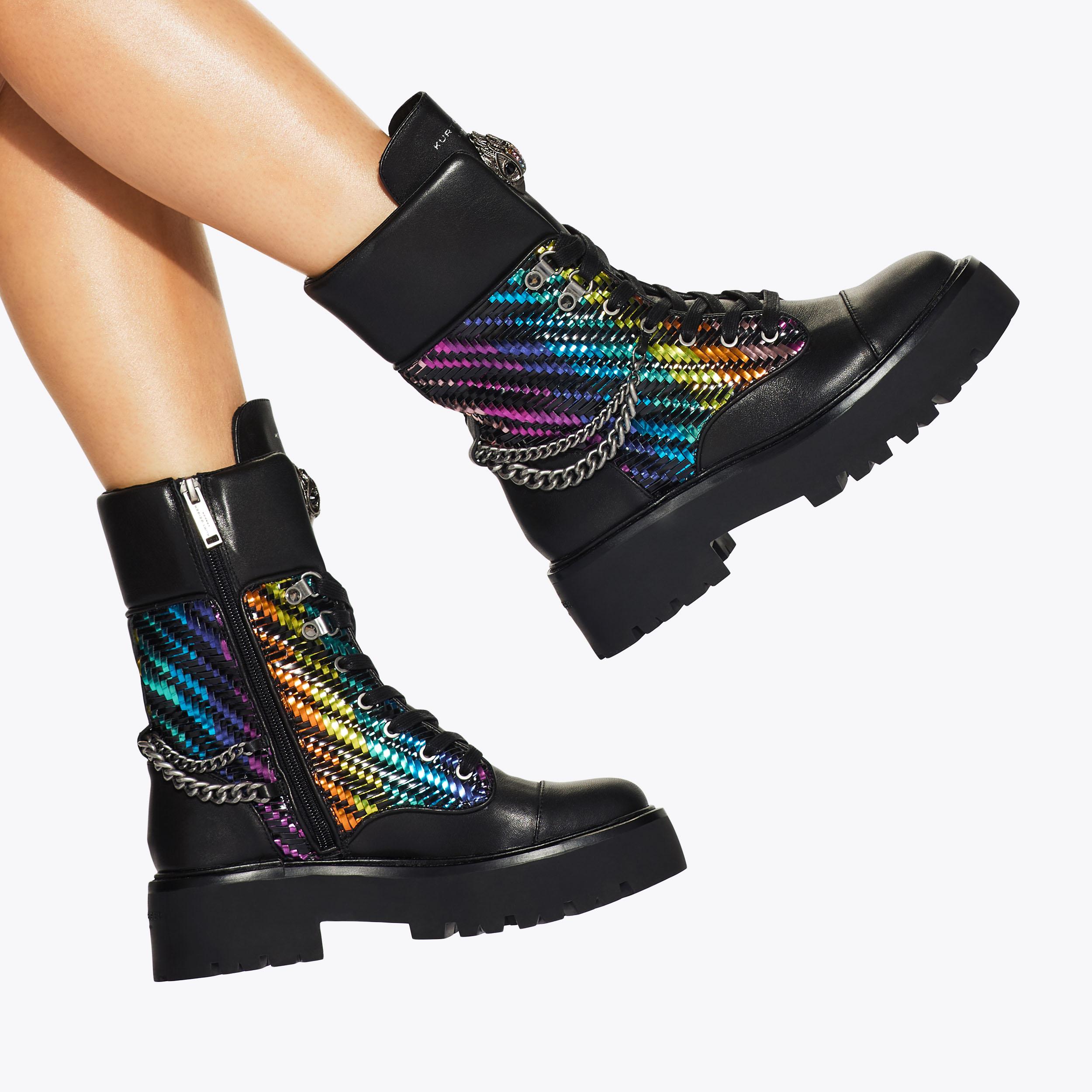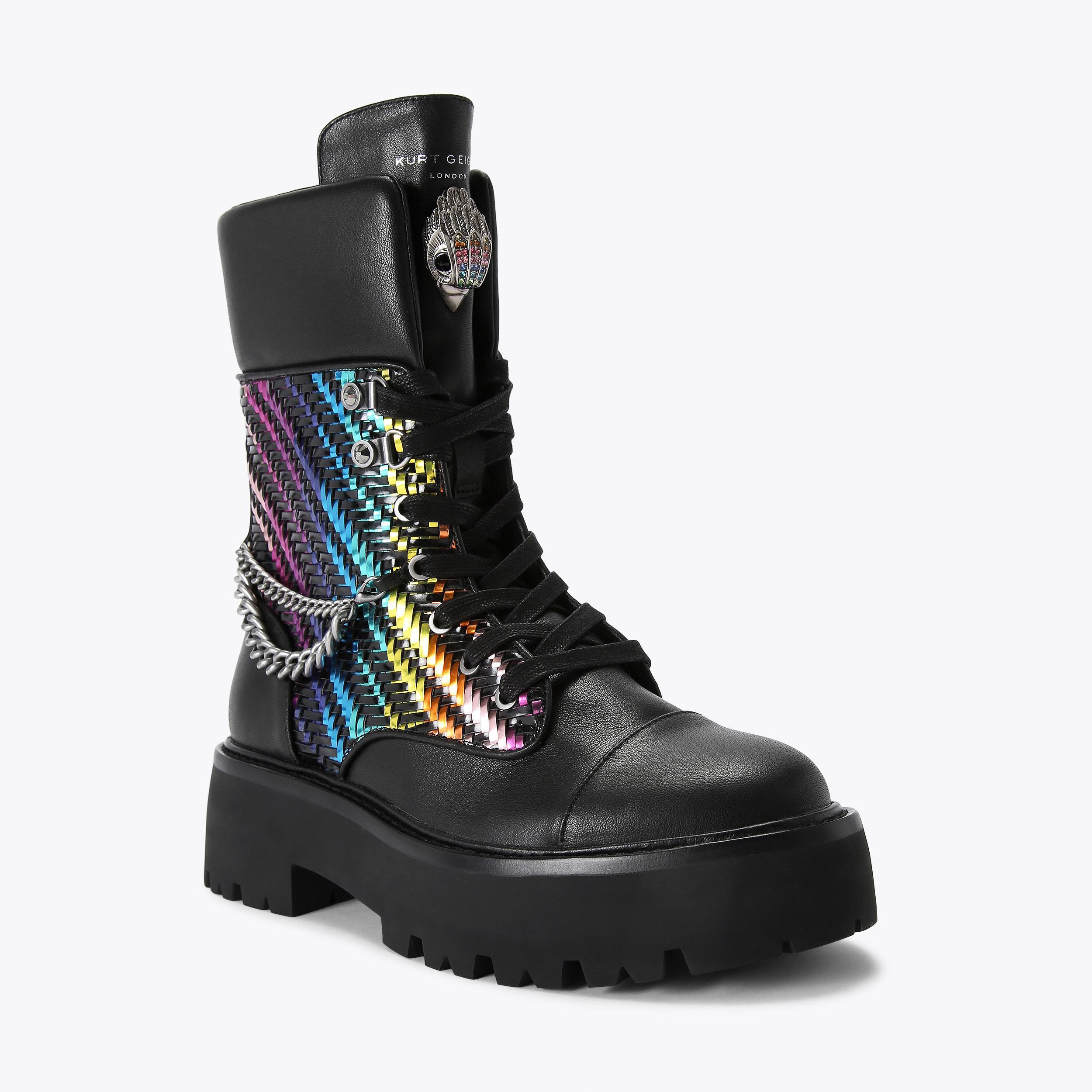 This Kensington Lace Combat Boot is crafted from a rainbow woven leather. There is a statement lace up front with antiqued silver eyelets and a matching chain around the back of the ankle. There is an antiqued silver eagle head on the tongue.&nb