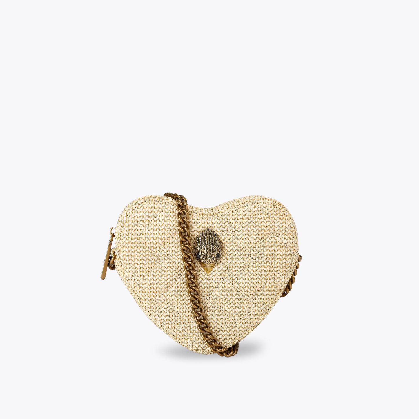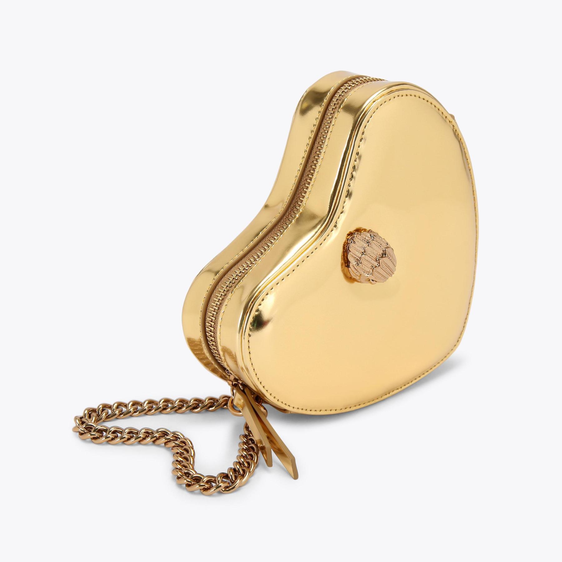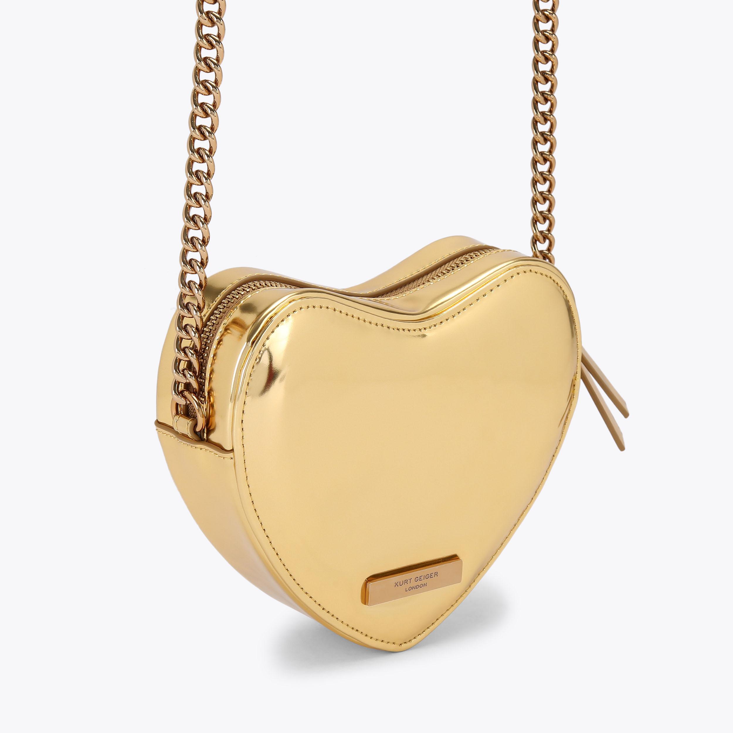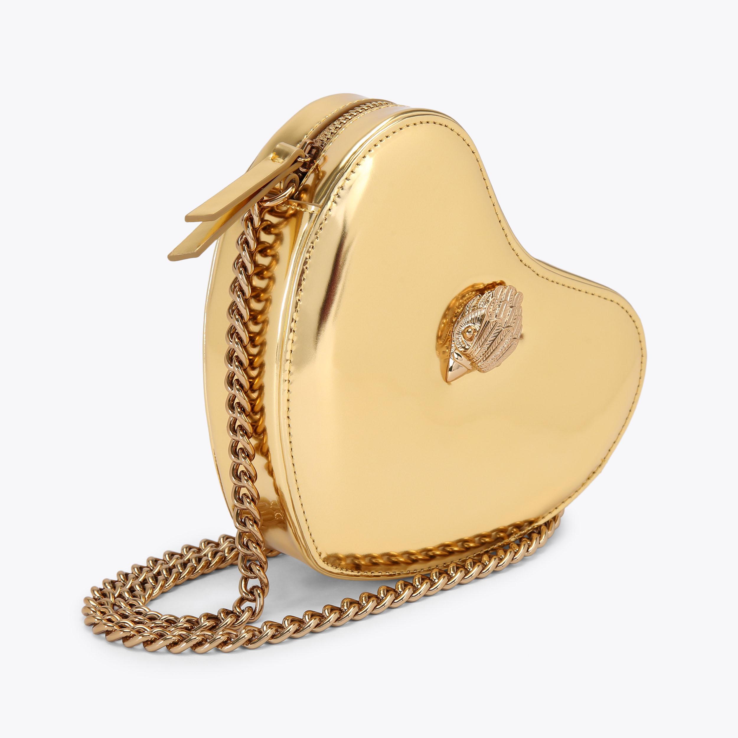 The Kensington Heart Purse is crafted from a metallic gold leather. The gold eagle head features all over feather detail on the front flap.