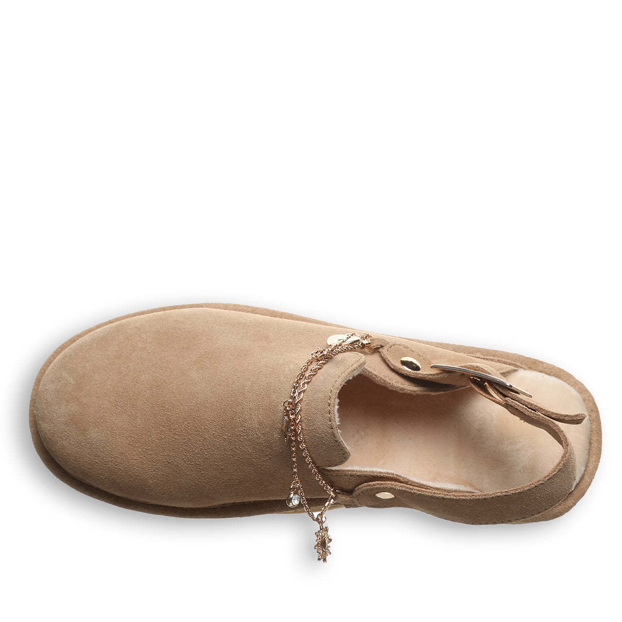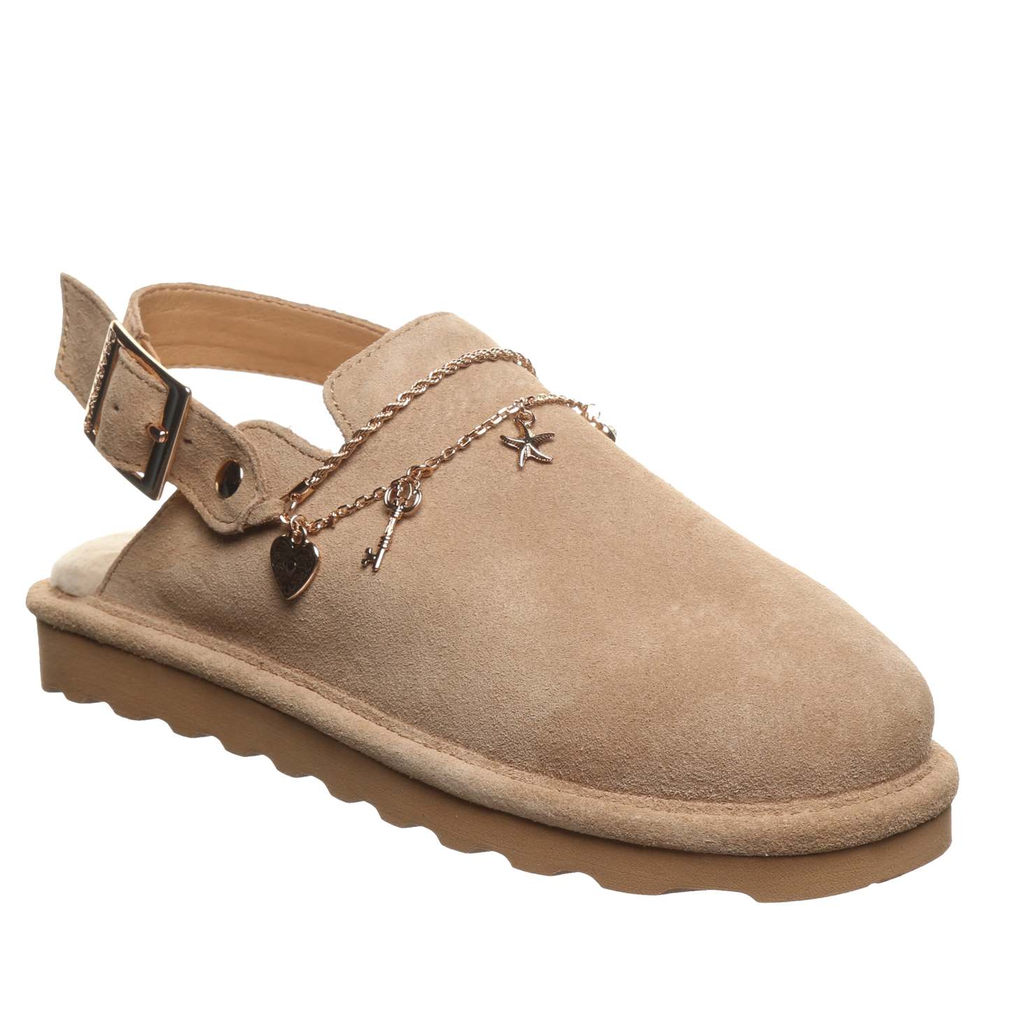 Step with Sparkle. A classic clog gets a glam upgrade with a dainty chain and playful charms that move with you. Adjustable ankle strap and charms make this the perfect fit for your unique style.