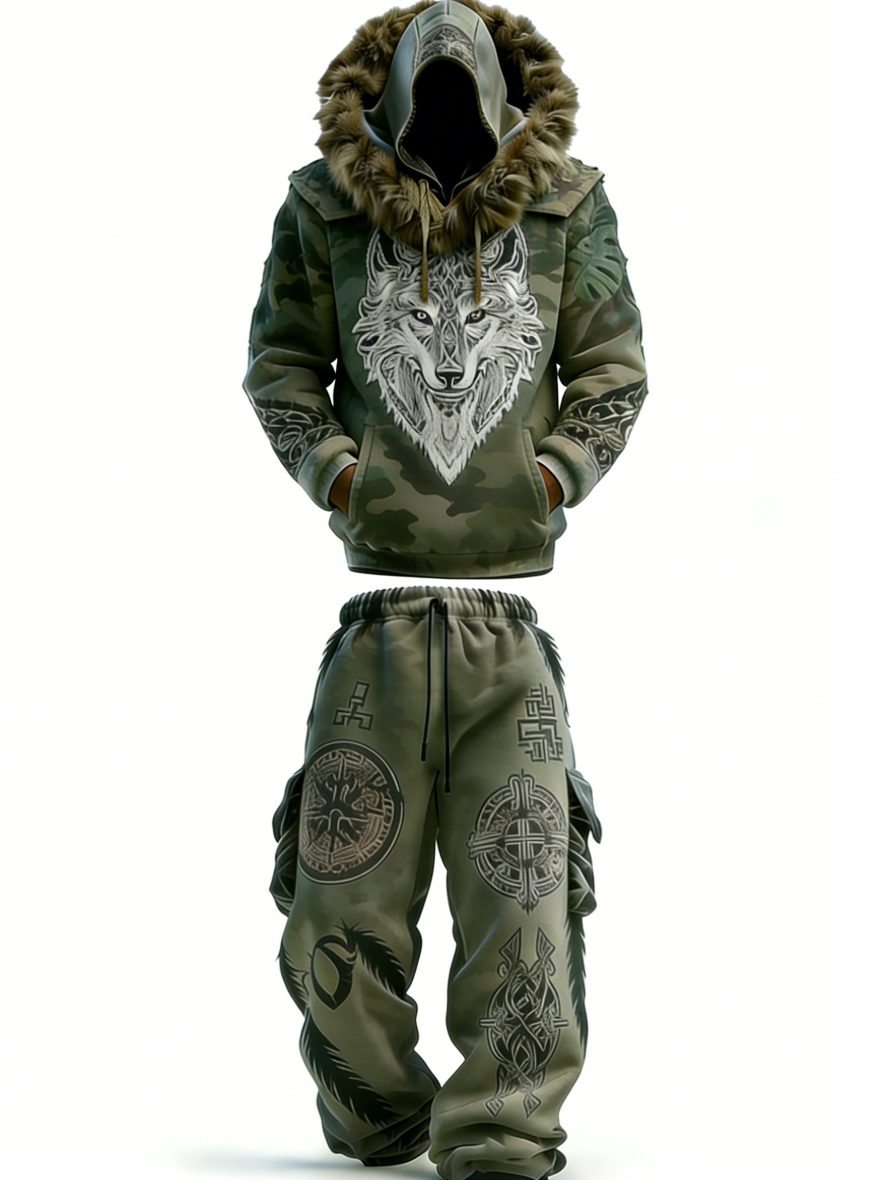 Men'S 3D Printed Camouflage Wolf Head Hooded Sweatshirt With Work Pants Set
