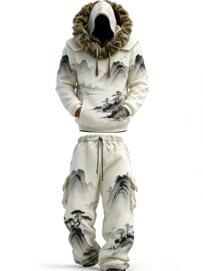 Men'S 3D Printed Ink Landscape Hooded Sweatshirt With Work Pants Set