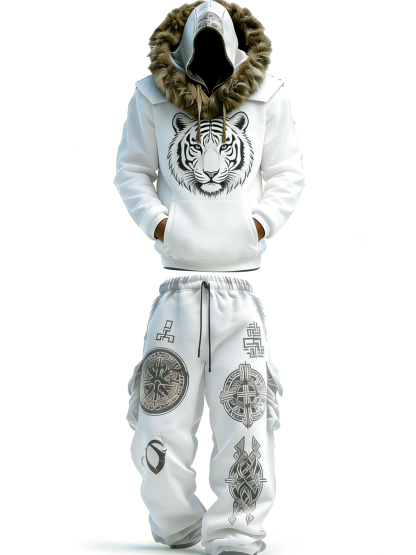 Men'S 3D Printed White Tiger Totem Hooded Sweatshirt With Work Pants Set