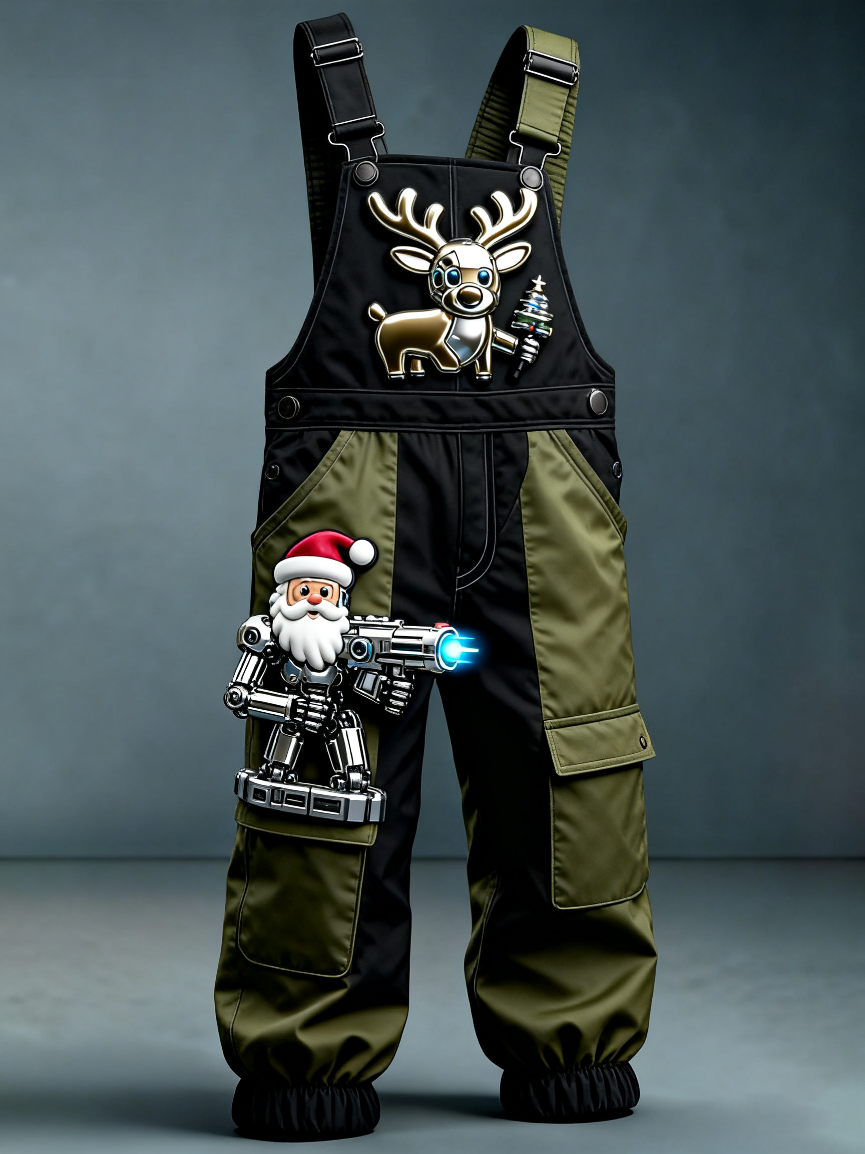 Men'S Black And Green Spliced Mechanical Christmas Reindeer Overalls