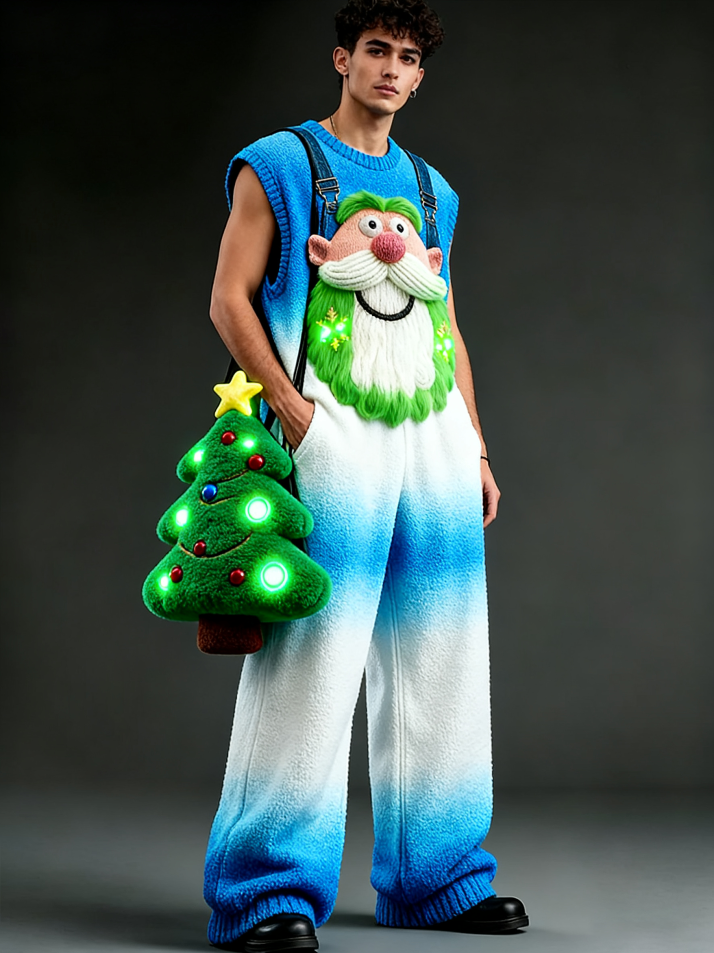 Men'S Christmas Gradient Fashion Blue And White Overalls With Green Velvet Vest