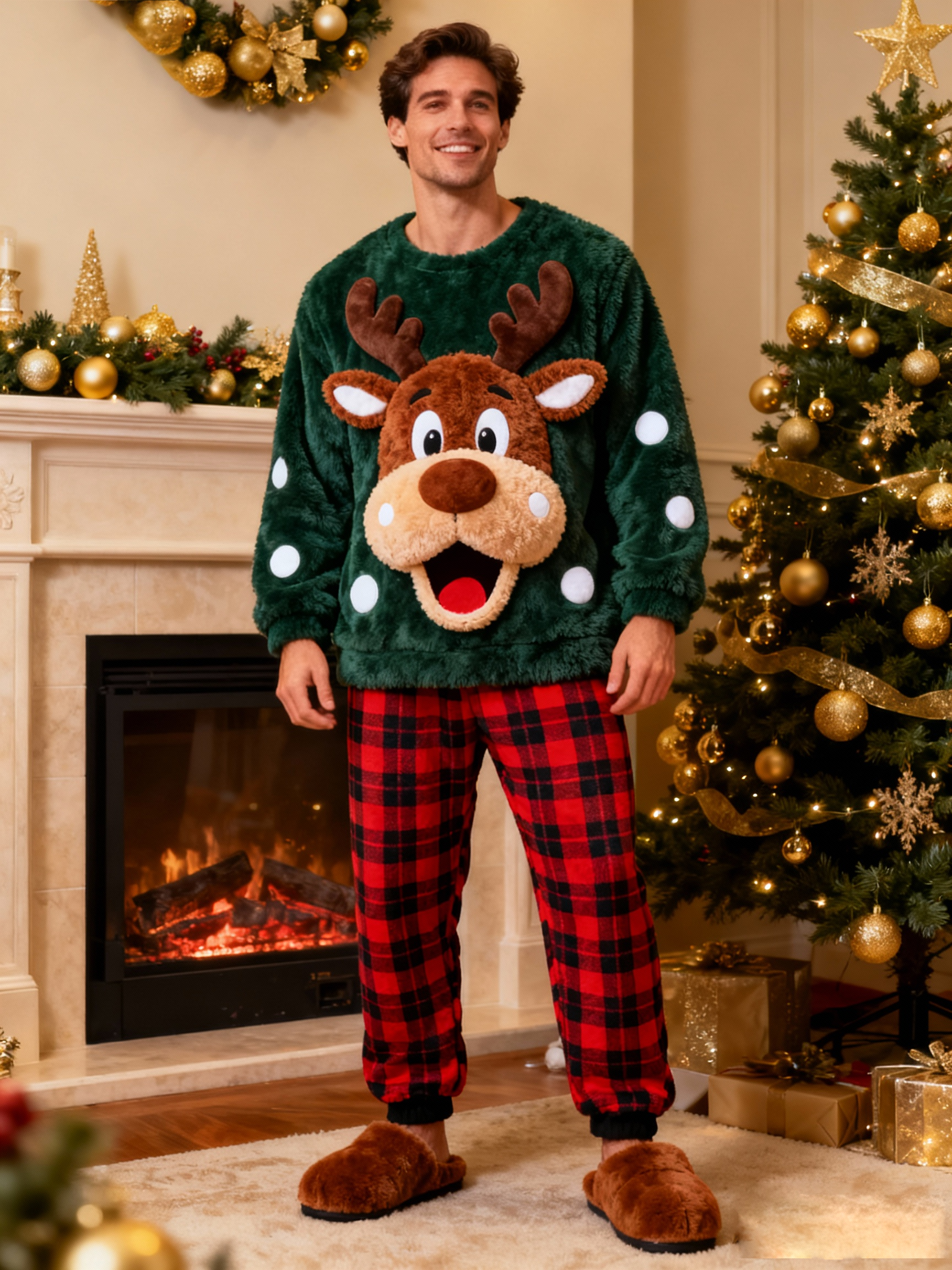 Men'S Christmas Reindeer Snowflake Themed Plush Checkered Pants Knitted Two-Piece Set