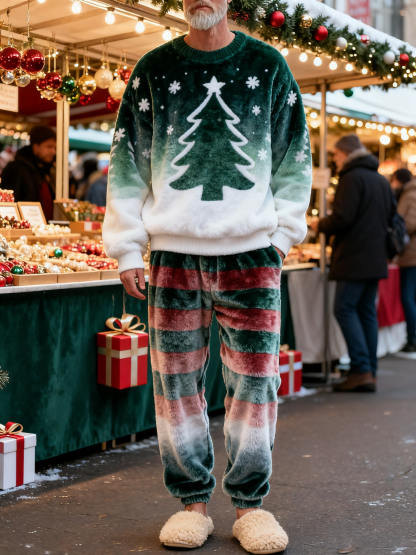 Men'S Christmas Themed Creative Fashion Gradient Plush Stripe Comfortable Top And Pants Two-Piece Set