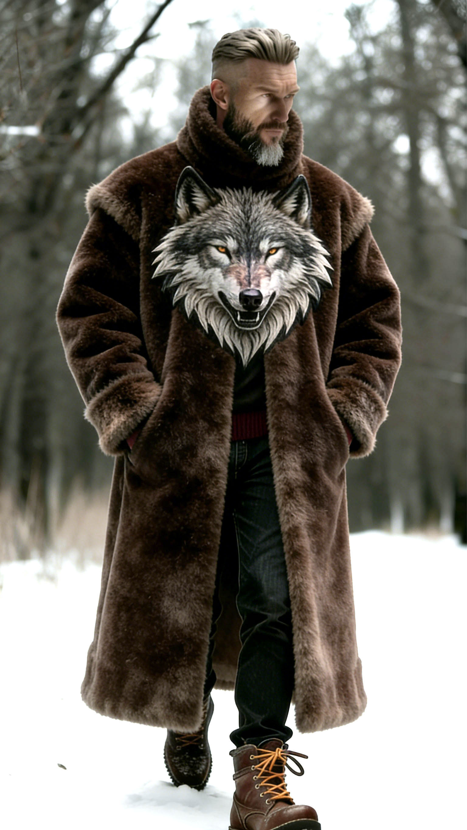 Men'S Classic Forest Soul Dark Brown Wolf Head Embroidered Simple Fur Coat