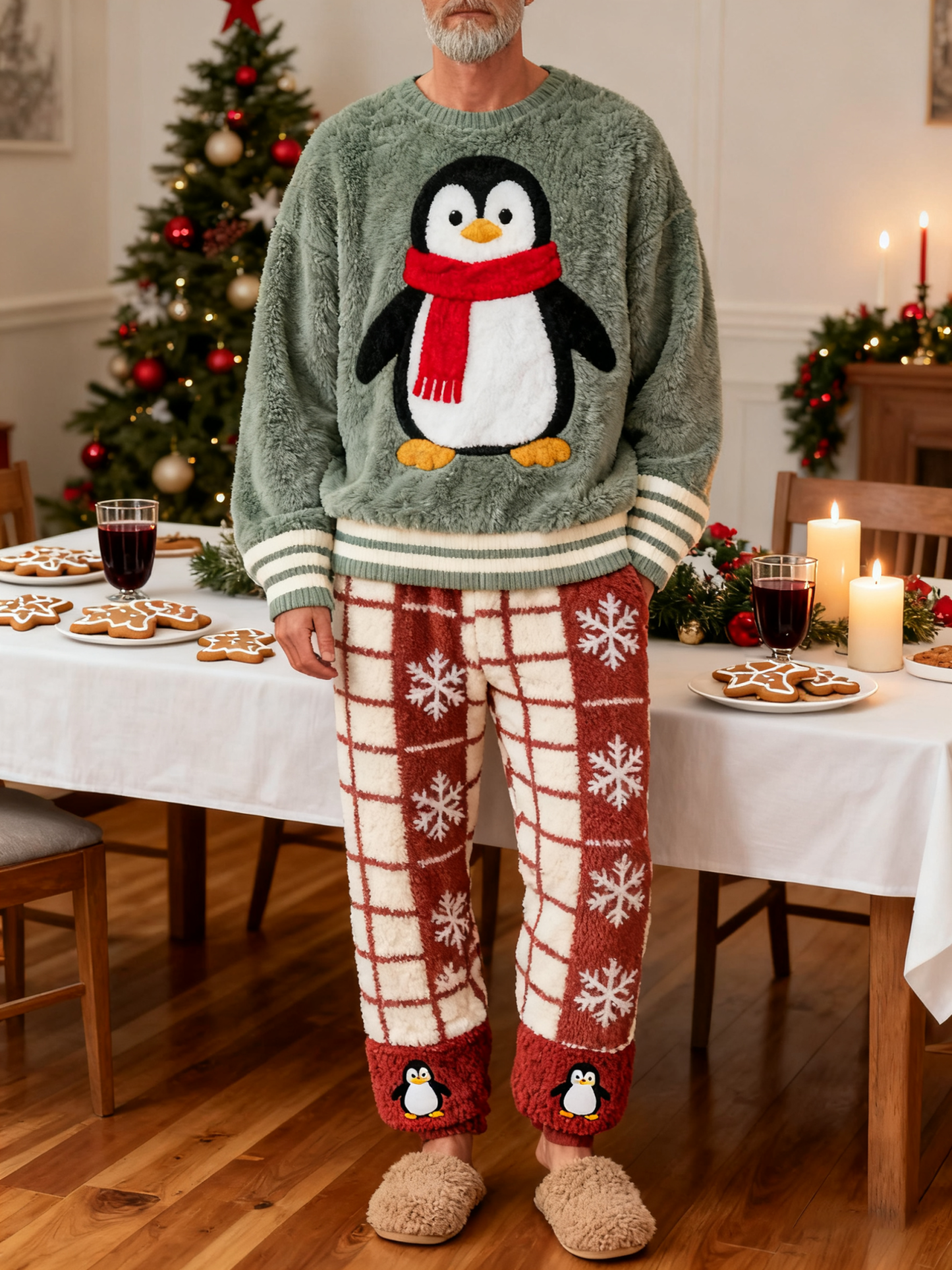 Men'S Creative Christmas Theme Penguin Checkered Contrast Pants Top Casual Fashion Two Piece Set