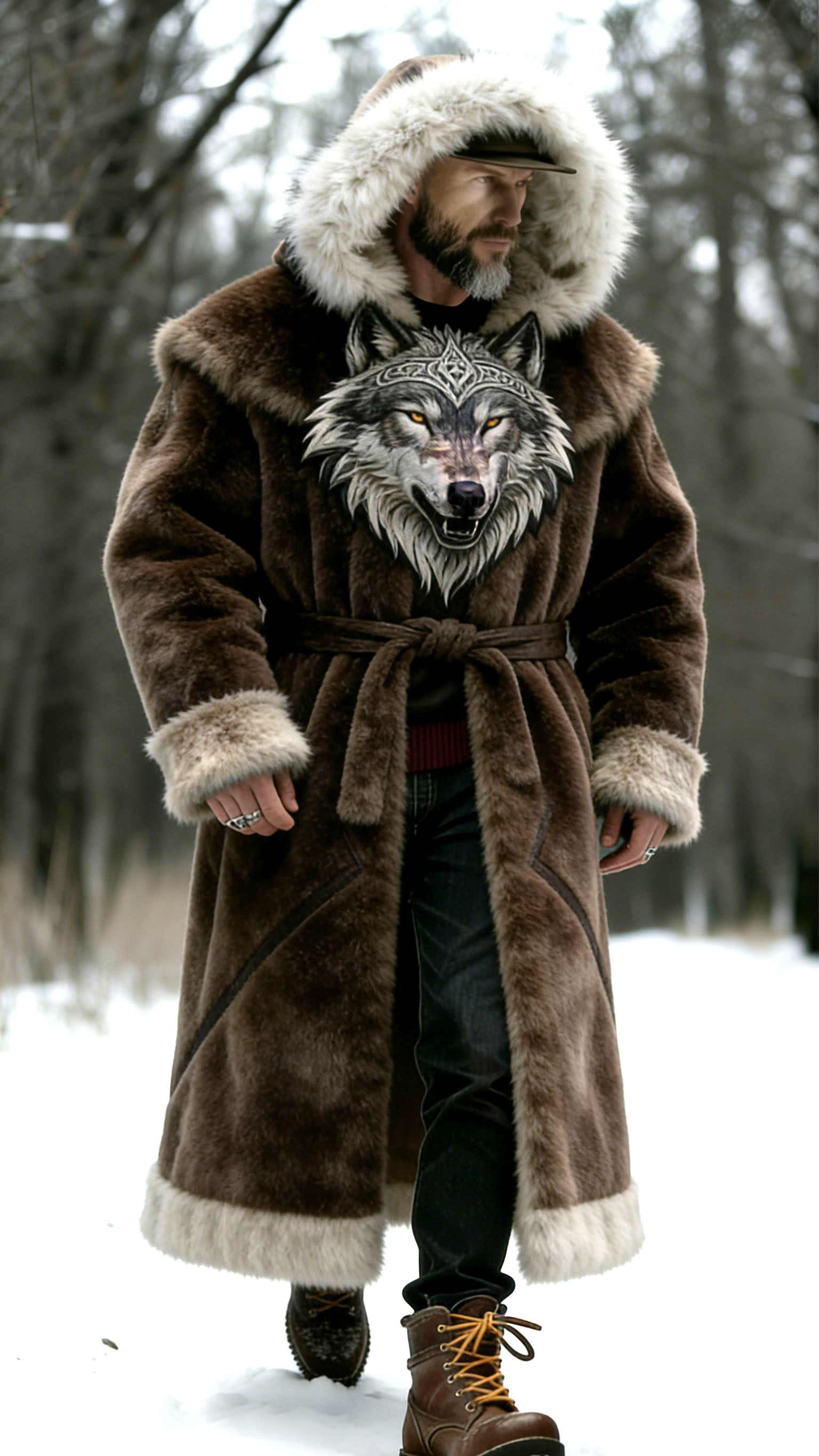 Men'S Domineering Tribal Chief, Dark Brown Fur Collar Belt, Wolf Head Embroidered Fur Coat