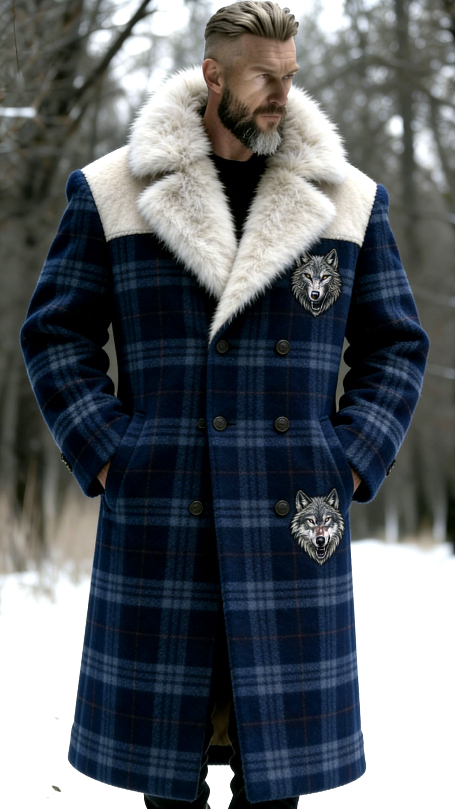 Men'S Elegant British Wolf Soul Blue And White Checkered Fur Collar, Wolf Head Embroidered Plush Coat