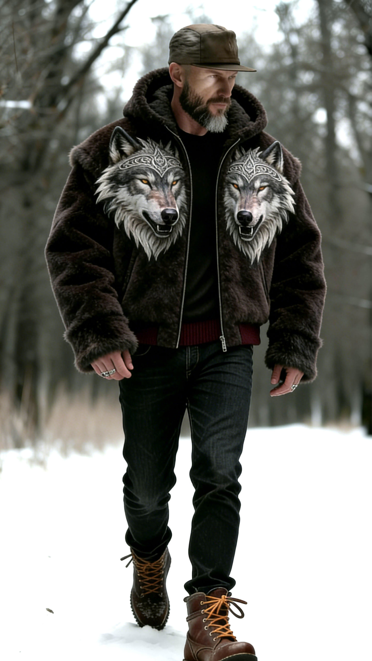 Men'S Fashion Double Wolf Legend Dark Brown Hooded Double Wolf Head Embroidered Zipper Fur Coat