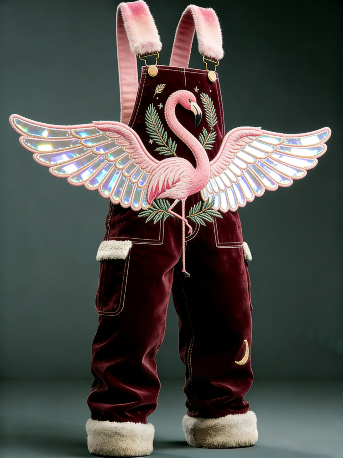 Men'S Flamingo Embroidered Rainbow Wings Plush Shoulder Strap Moon Decoration Dreamy Design Wine Red Velvet Shoulder Strap Pants