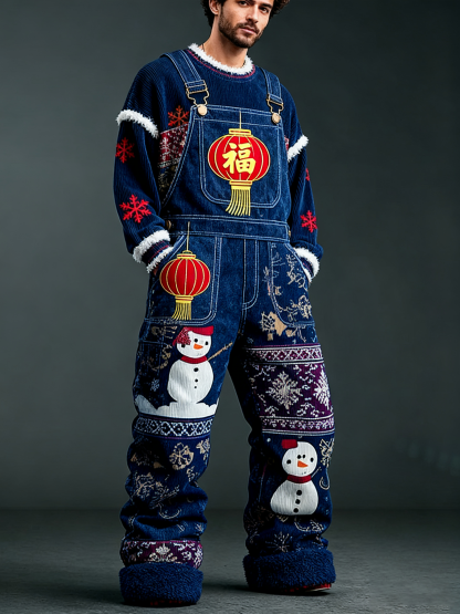 Men'S Fun Christmas Snowflake Snowman Themed Patch Warm Denim Jumpsuit