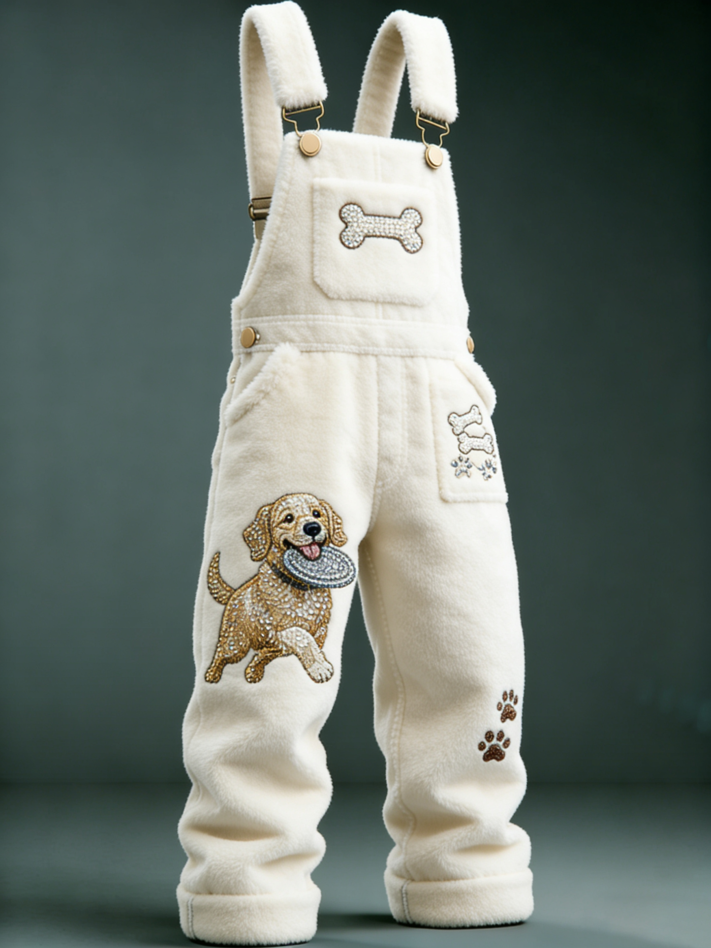 Men'S Golden Haired Frisbee Embroidered Bone Decoration Claw Print Pattern Warm And Comfortable Off White Plush Strap Pants