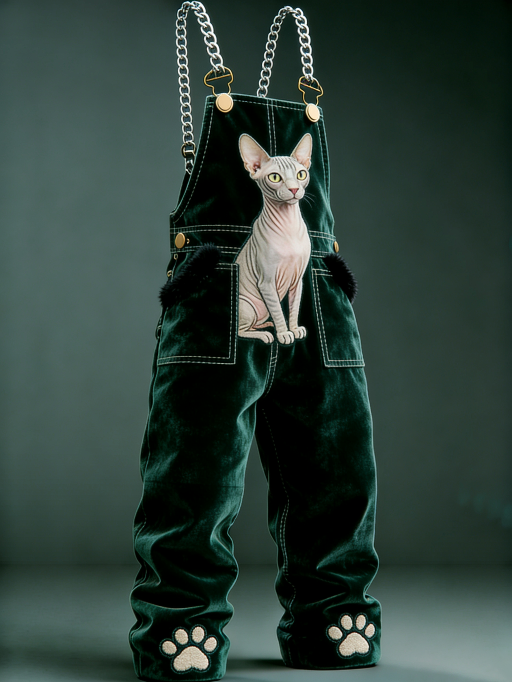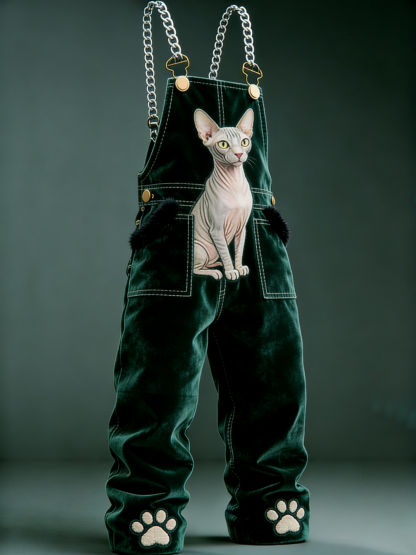 Men'S Hairless Cat Embroidery Chain Shoulder Strap Claw Print Pants Legs Dark Green Velvet Shoulder Strap Pants