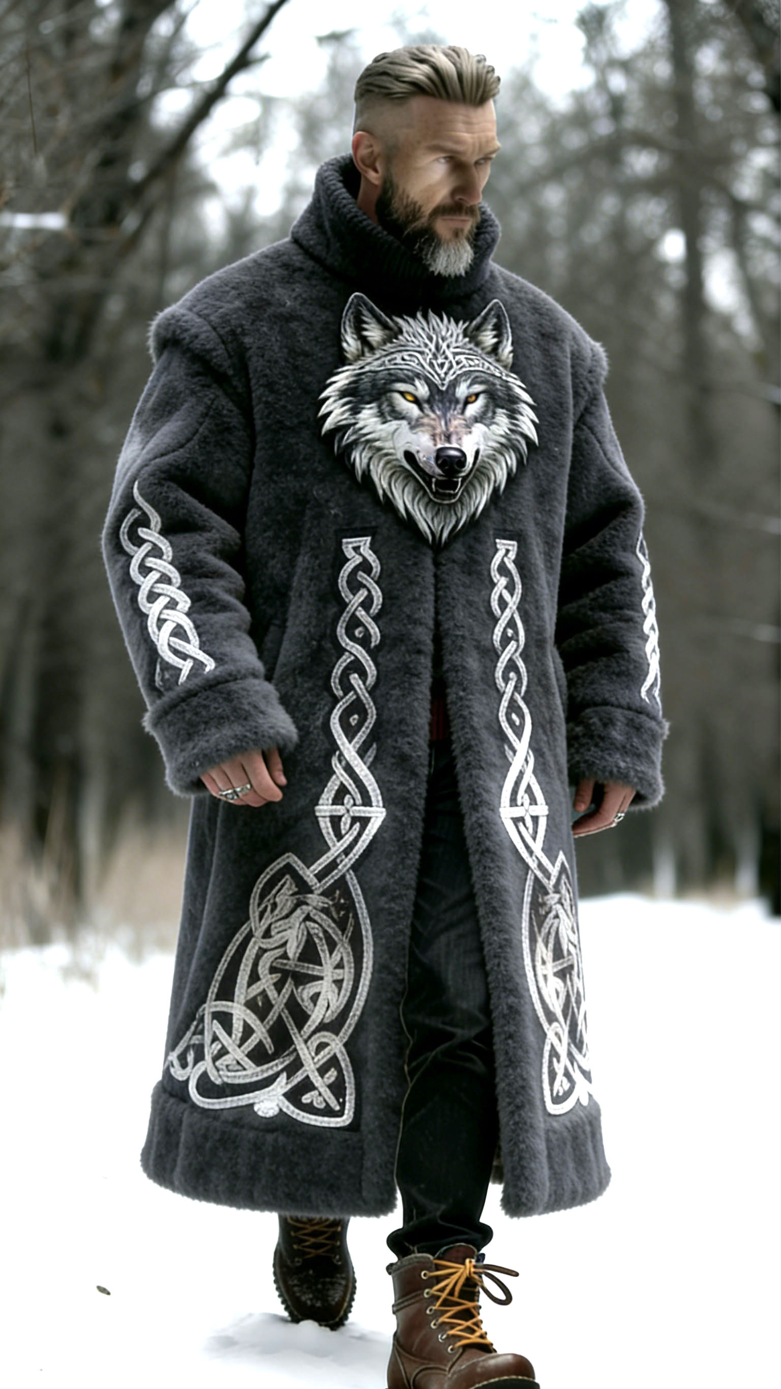 Men'S Mysterious Forest Soul Dark Grey Wolf Head Embroidered Celtic Pattern Fur Coat